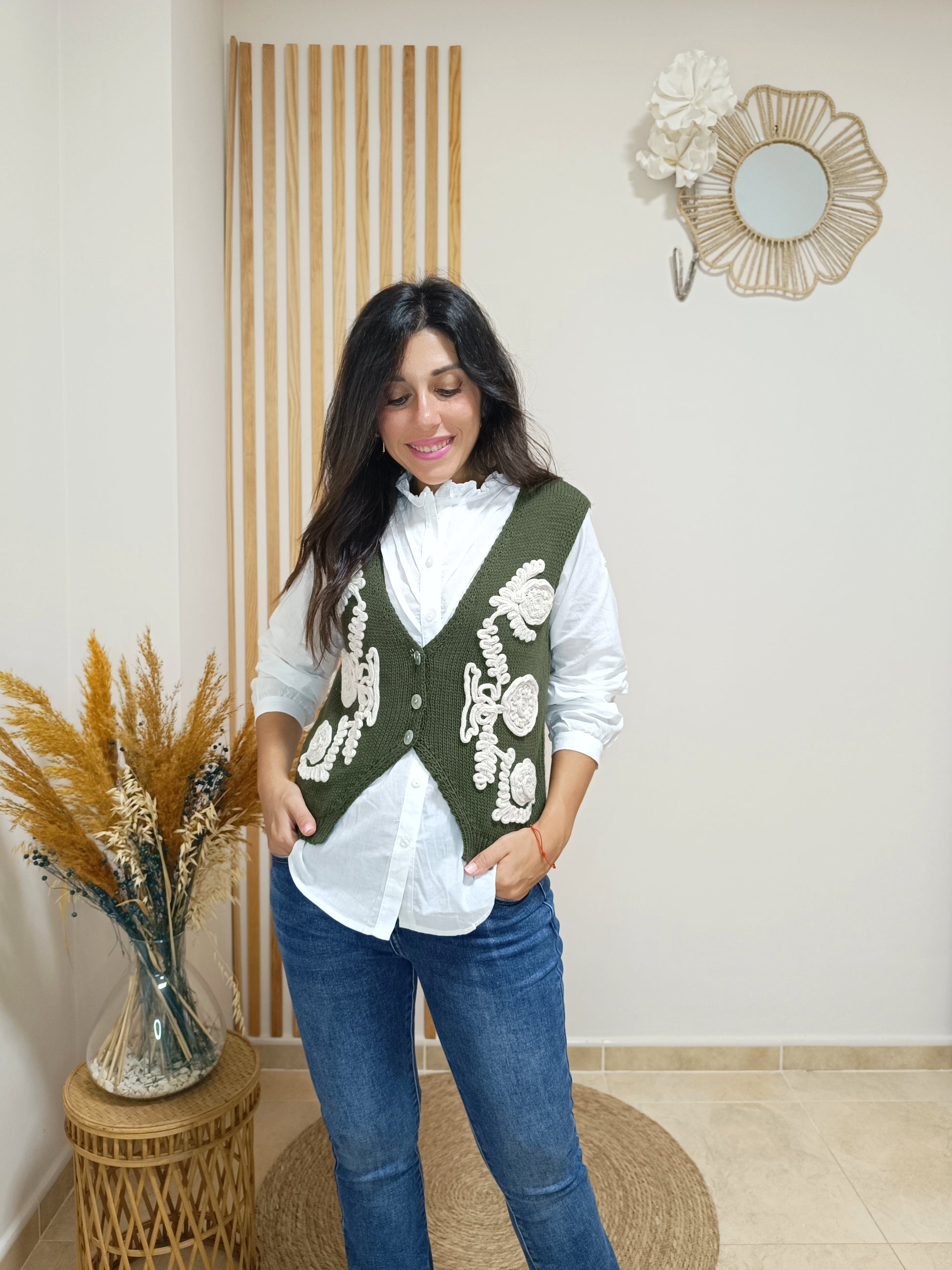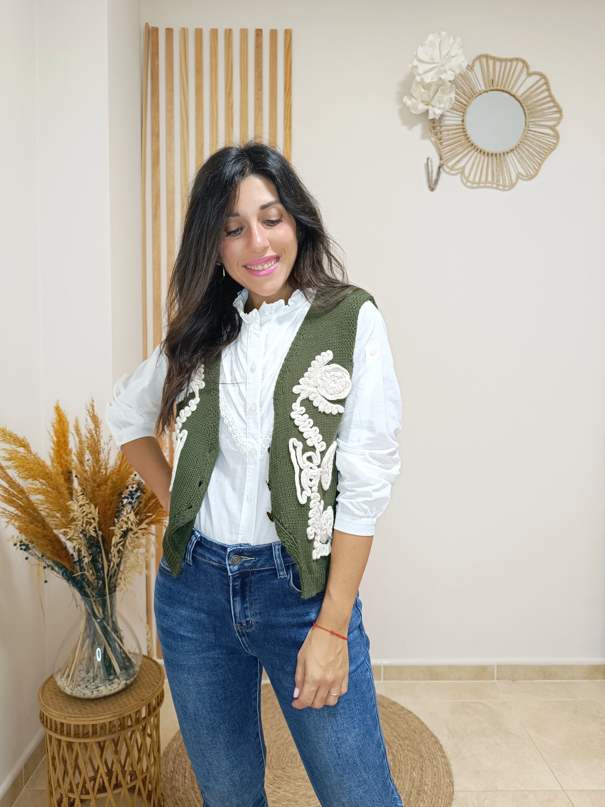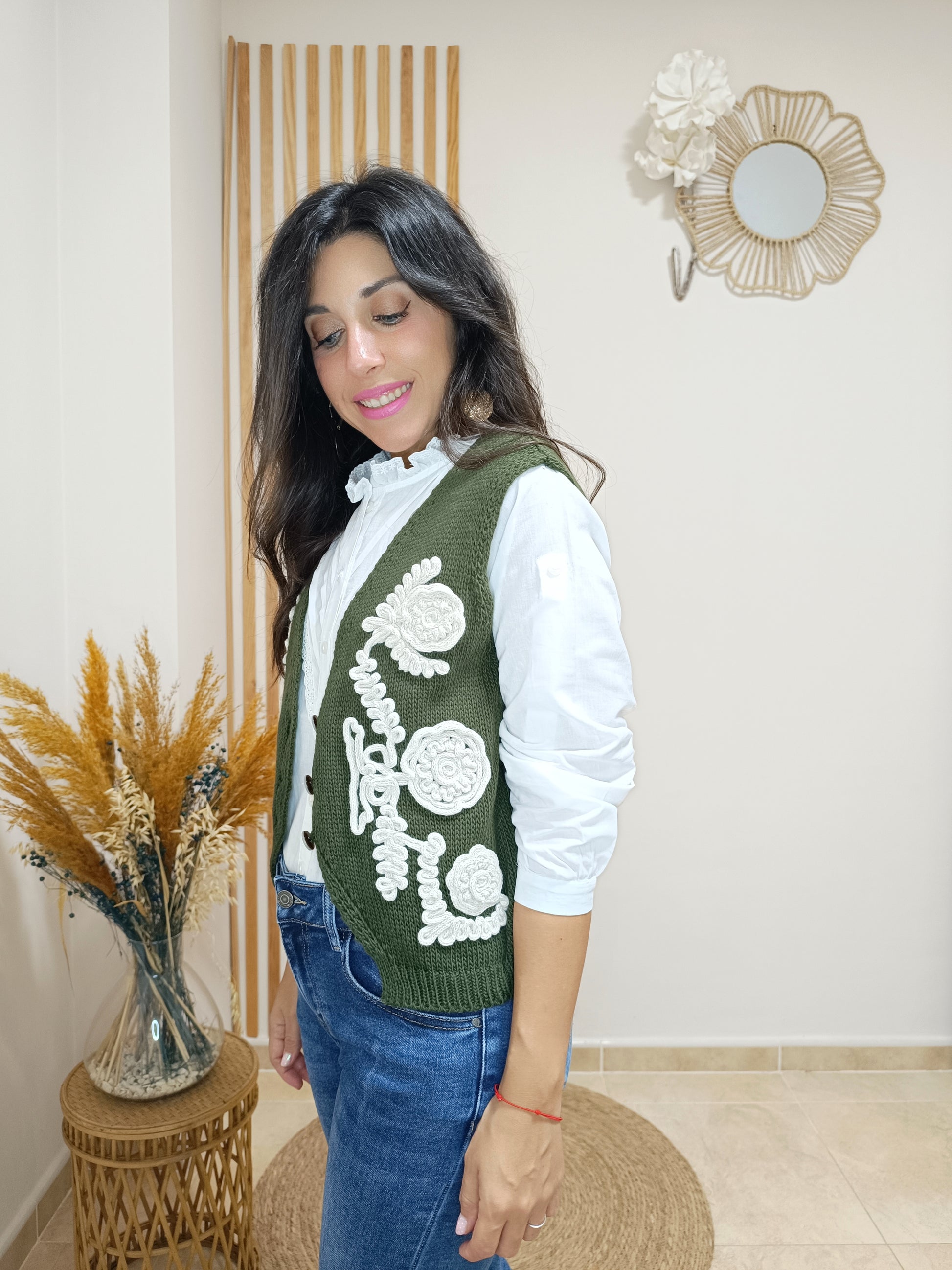 Sobre un elegante verde caqui de fondo, esta prenda destaca por su original bordado blanco en relieve y con motivos floreales. 100% acrílico y de lo más abrigado para tus outfits de invierno. Llévalo abierto o cerrado con sus botones centrales.