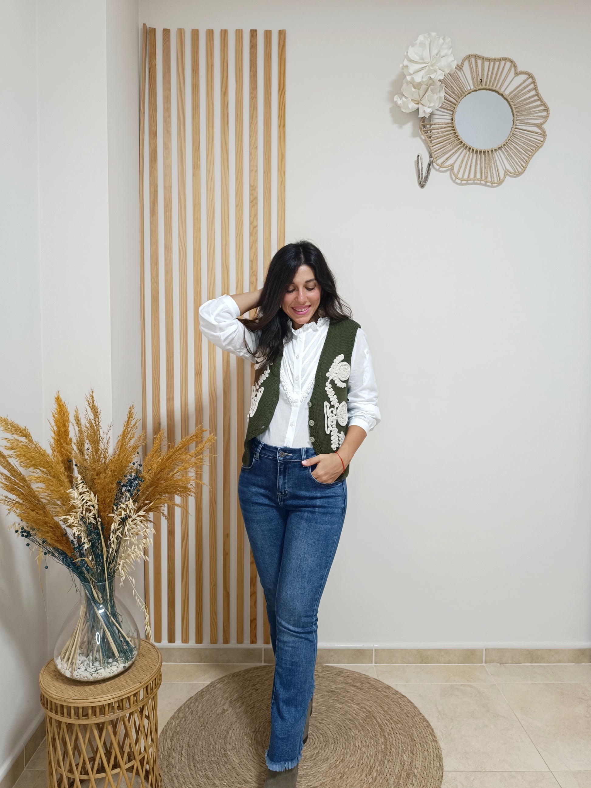 Es ese complemento perfecto que siempre suma y eleva tu look. Perfecto para combinar con prendas neutras y básicas, el chaleco Sabina resulta ideal para un look todoterreno con vaquero y camisa blanca.