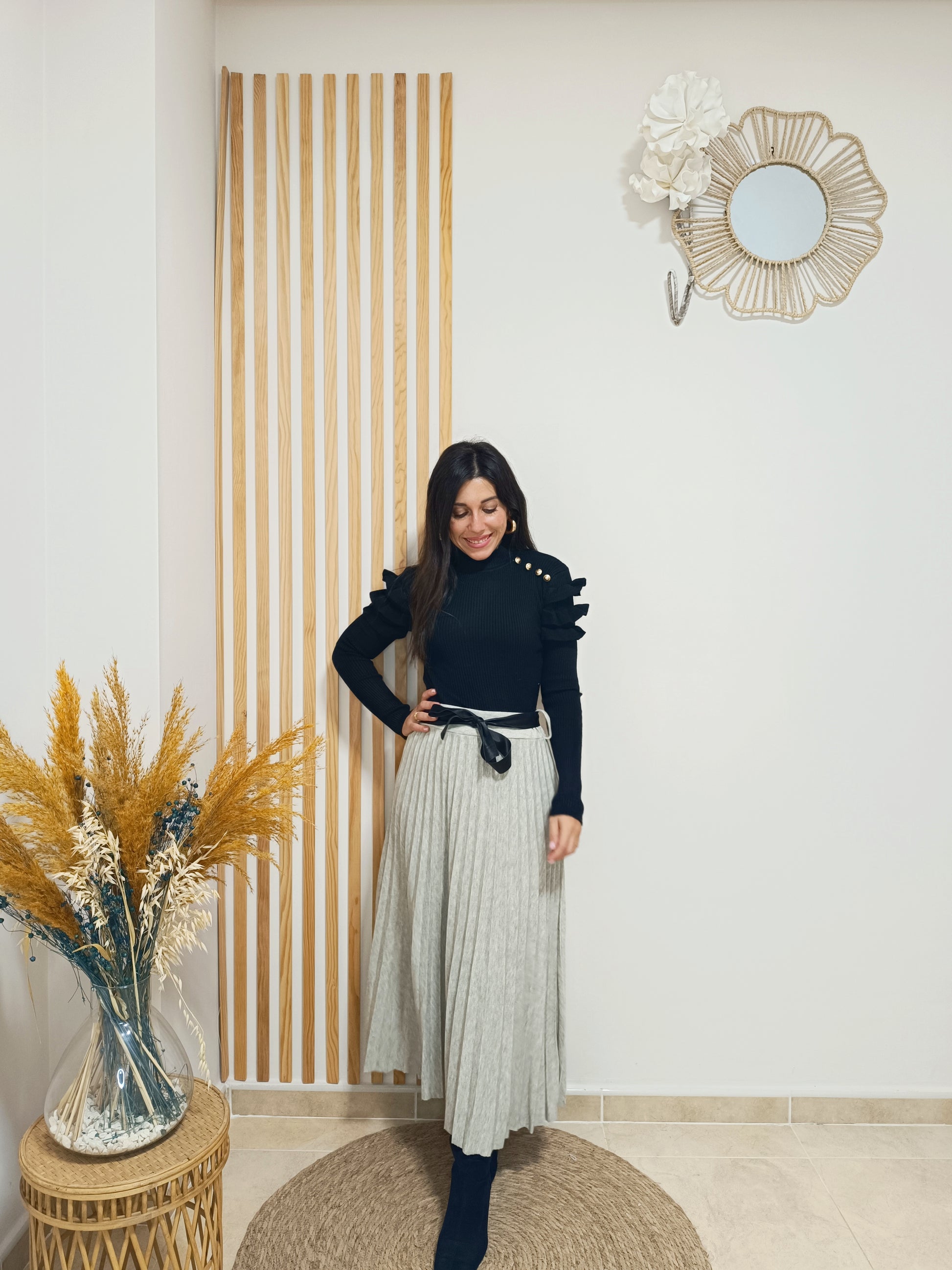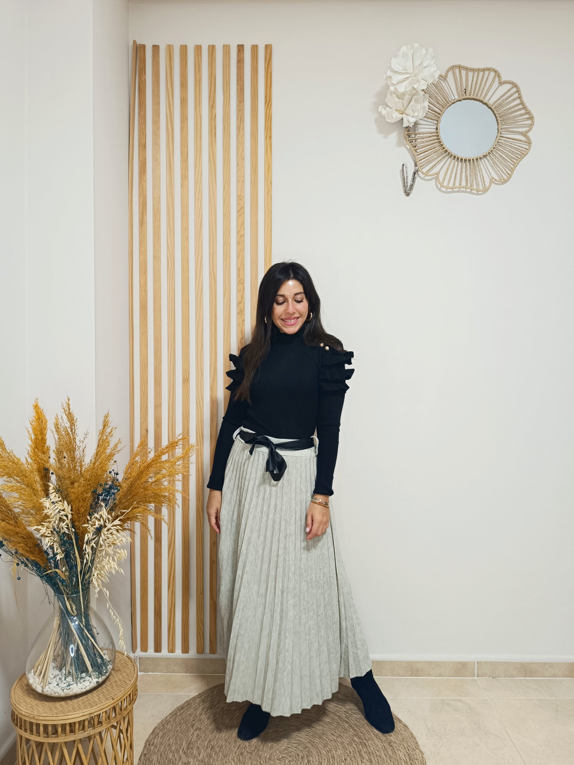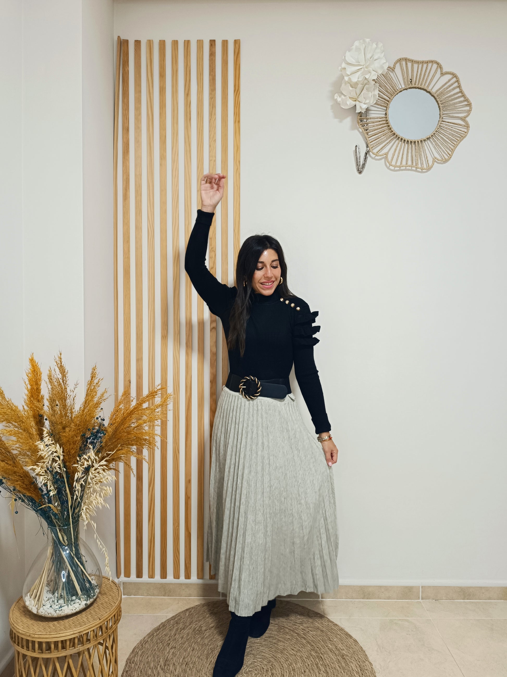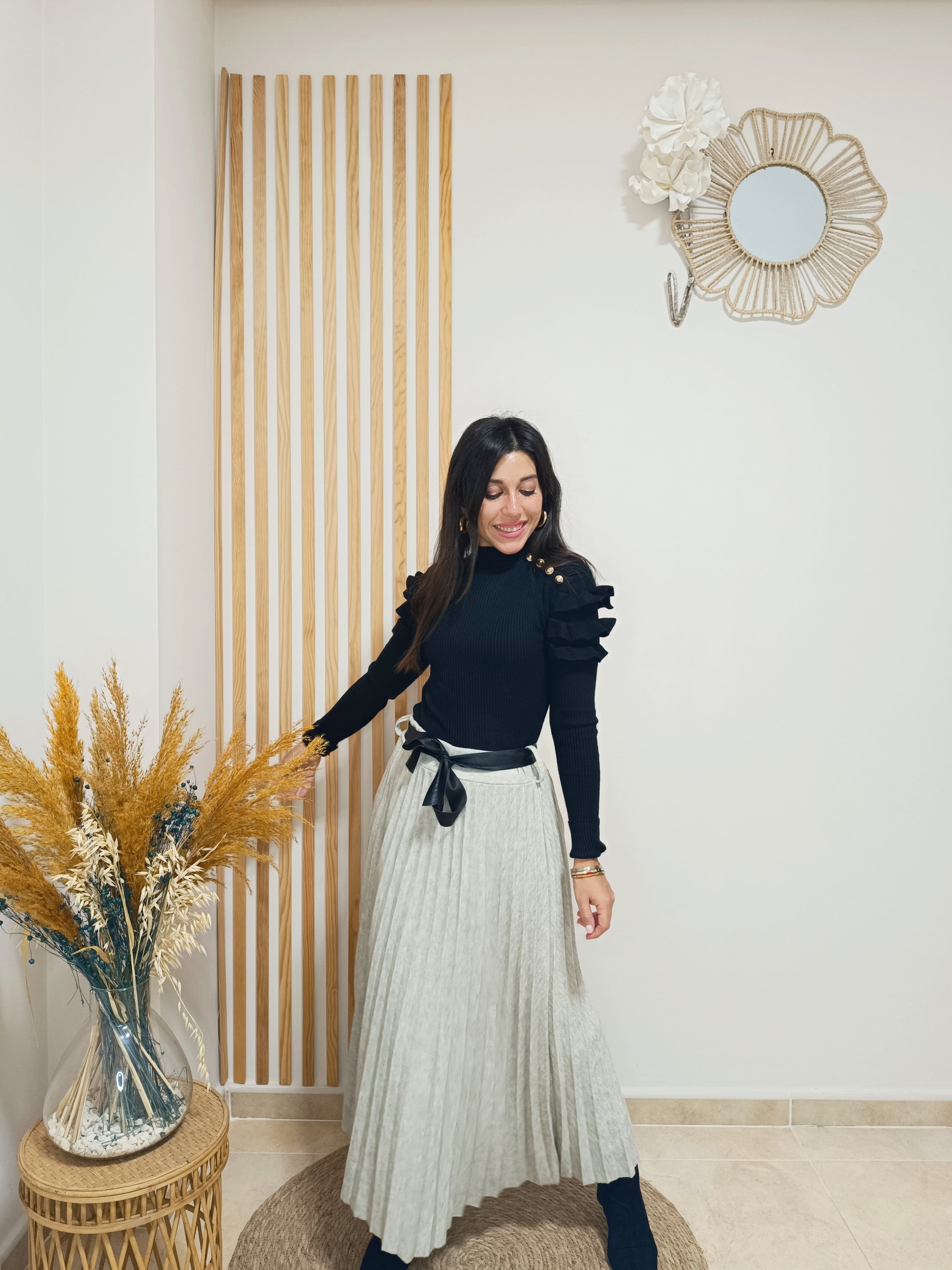 Cinturilla totalmente elástica. Incluye lazada de polipiel negra para ajustar a modo de cinturón.