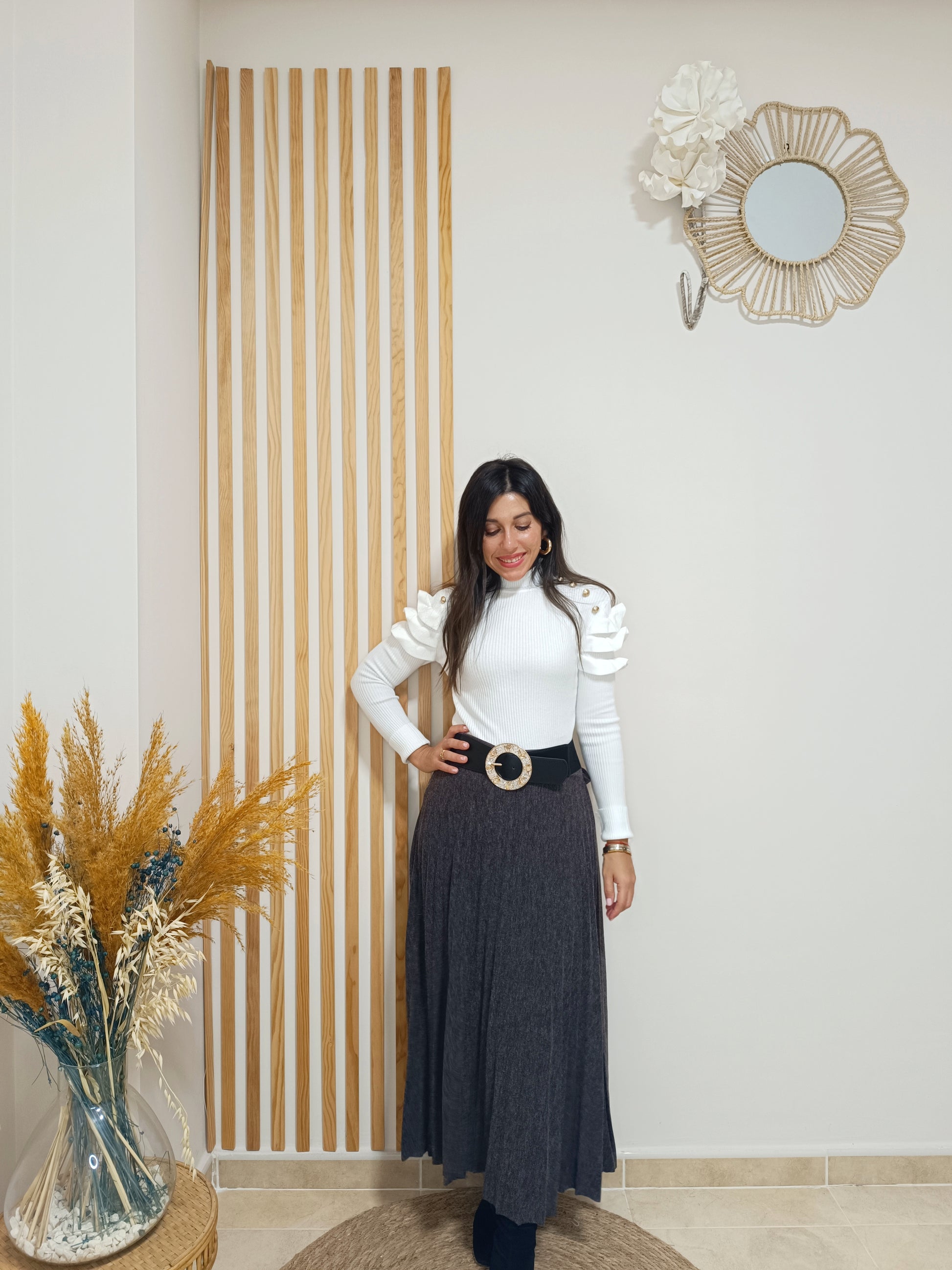 Cinturilla totalmente elástica. Incluye lazada de polipiel negra para ajustar a modo de cinturón.