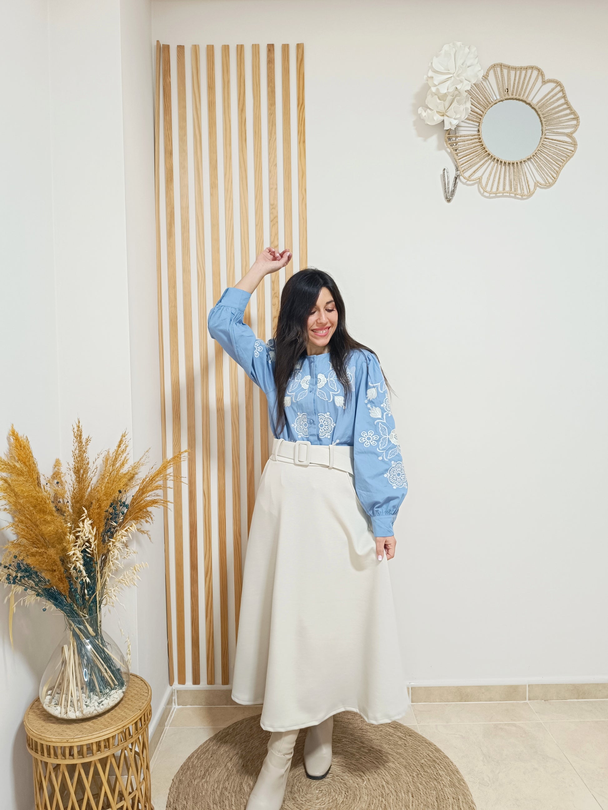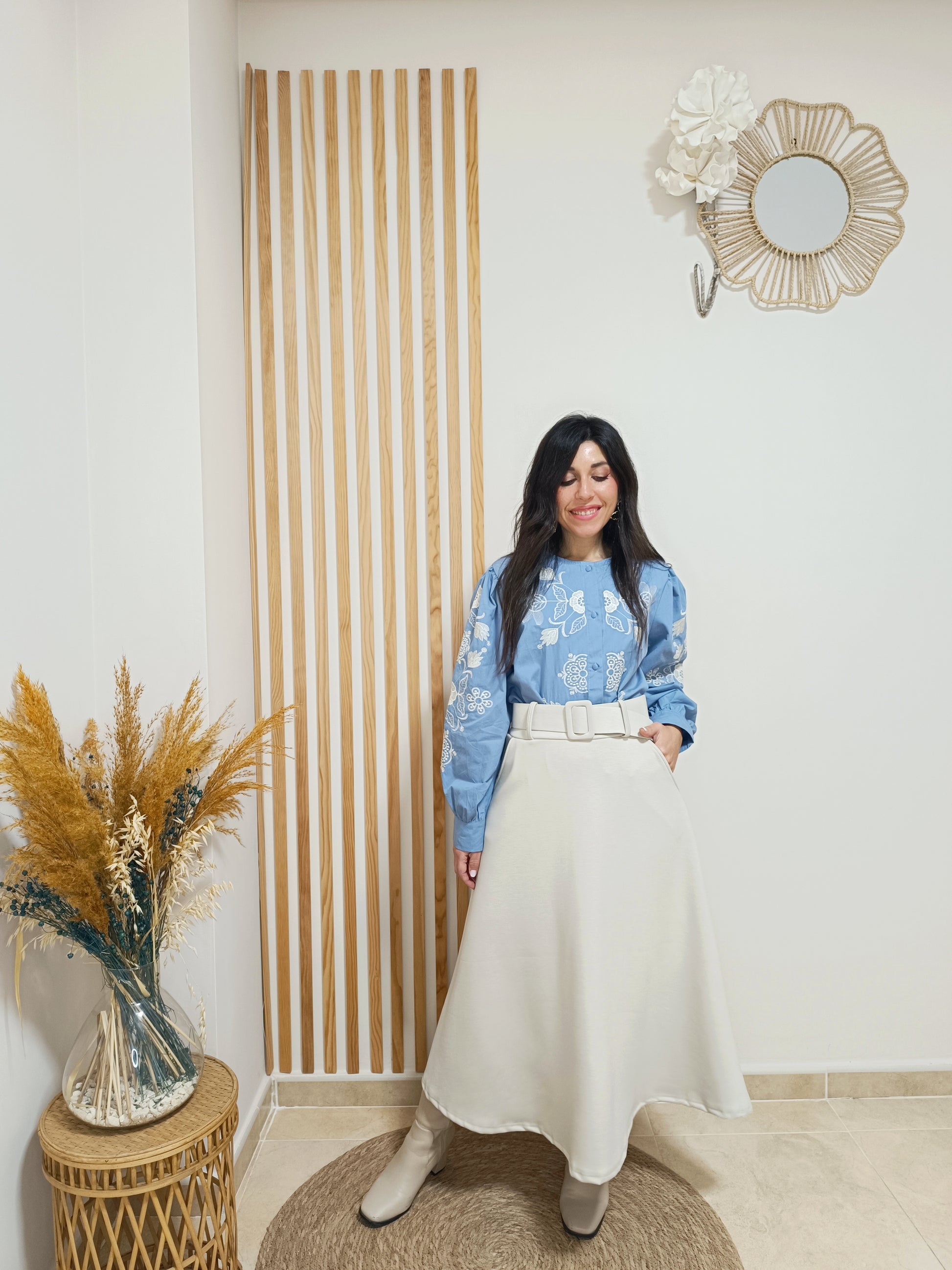 Márcate un look impecable con nuestra falda Donna. Es caballo ganador para esos looks todoterreno con los que salir de casa a primera hora sin saber lo que el día nos deparará. Su corte ligeramente evasé y su largo midi te aportarán un toque de lo más femenino y favorecedor, ya que su cinturilla alta acentuará aún más tu figura.