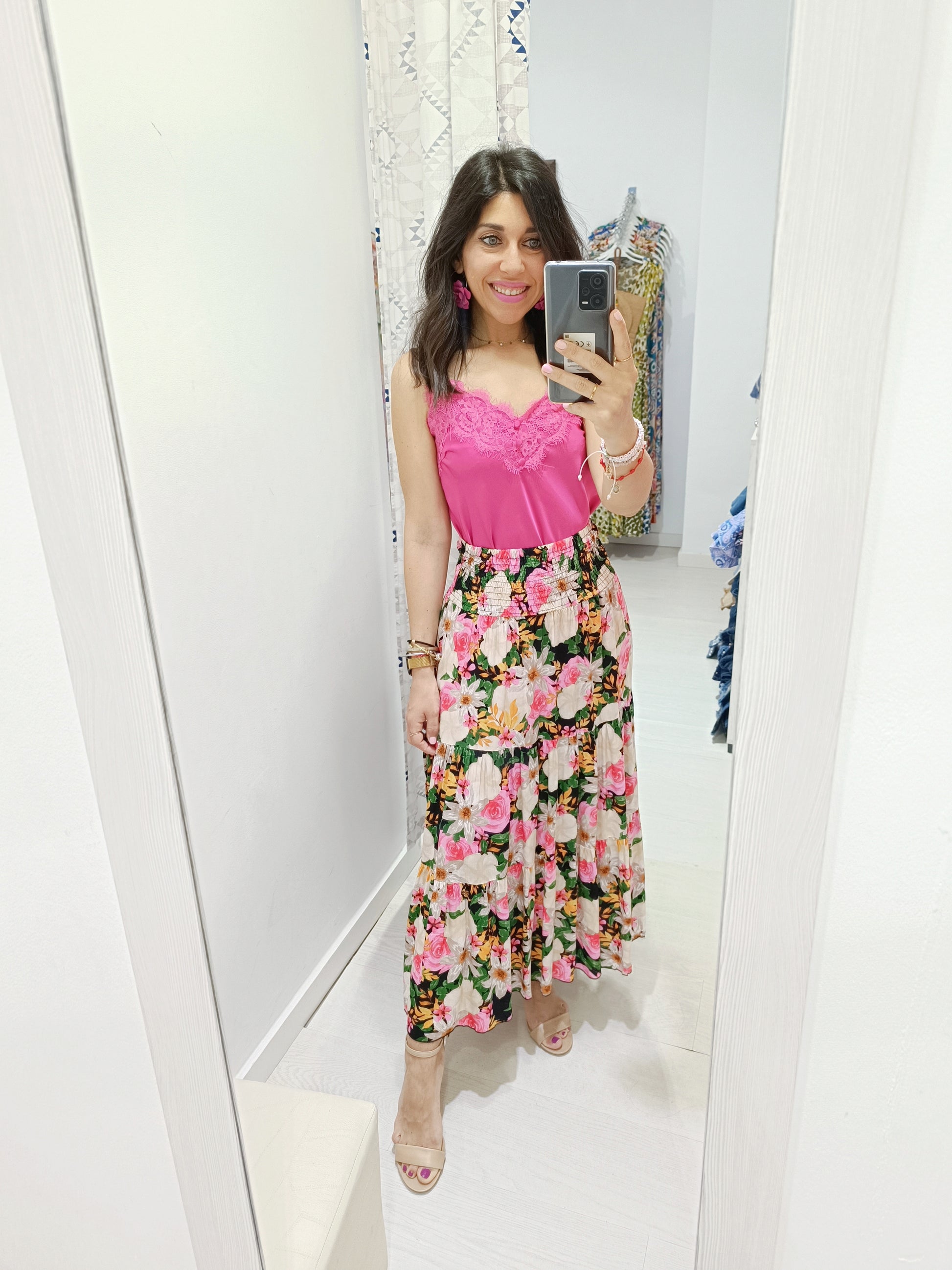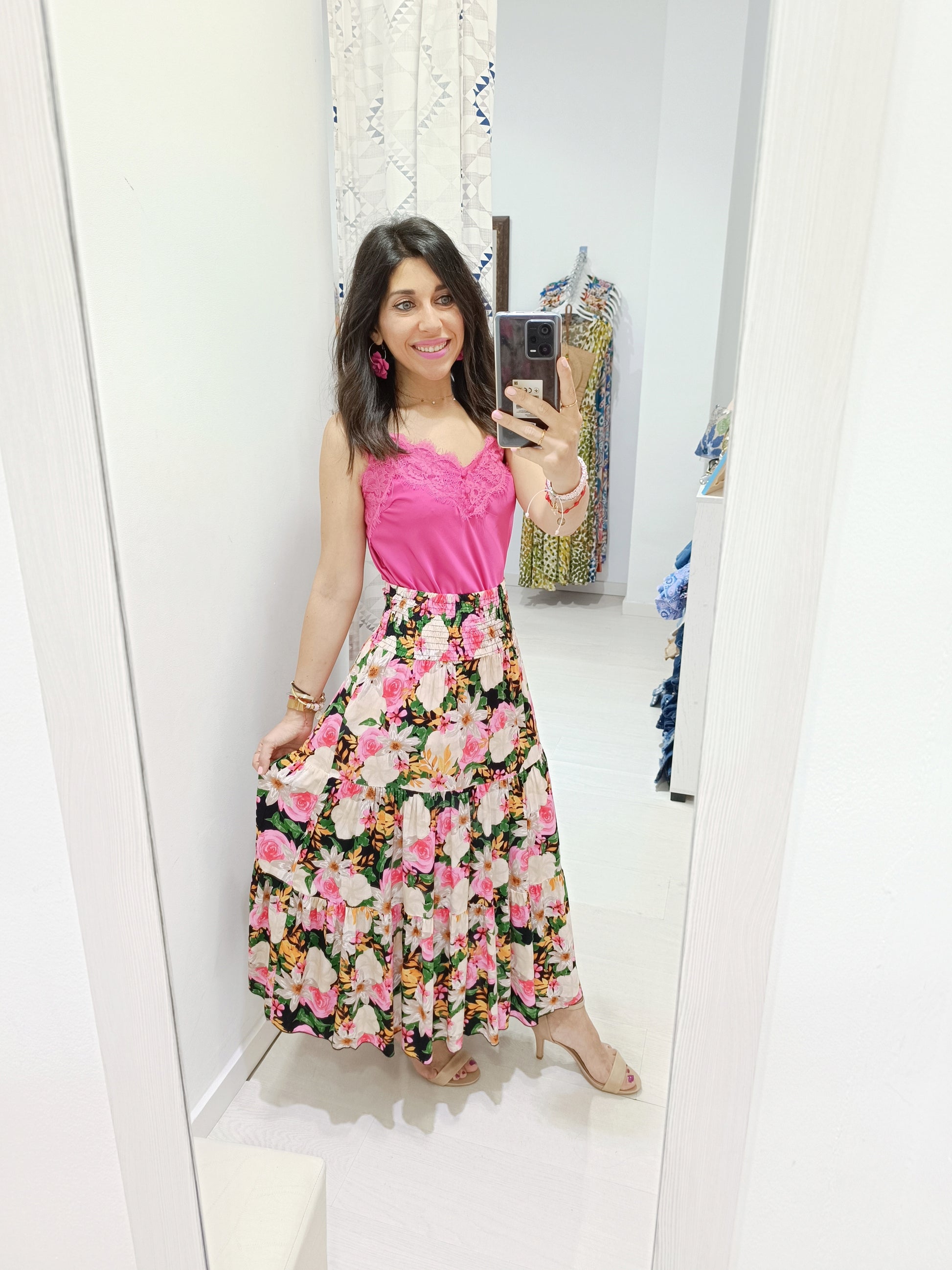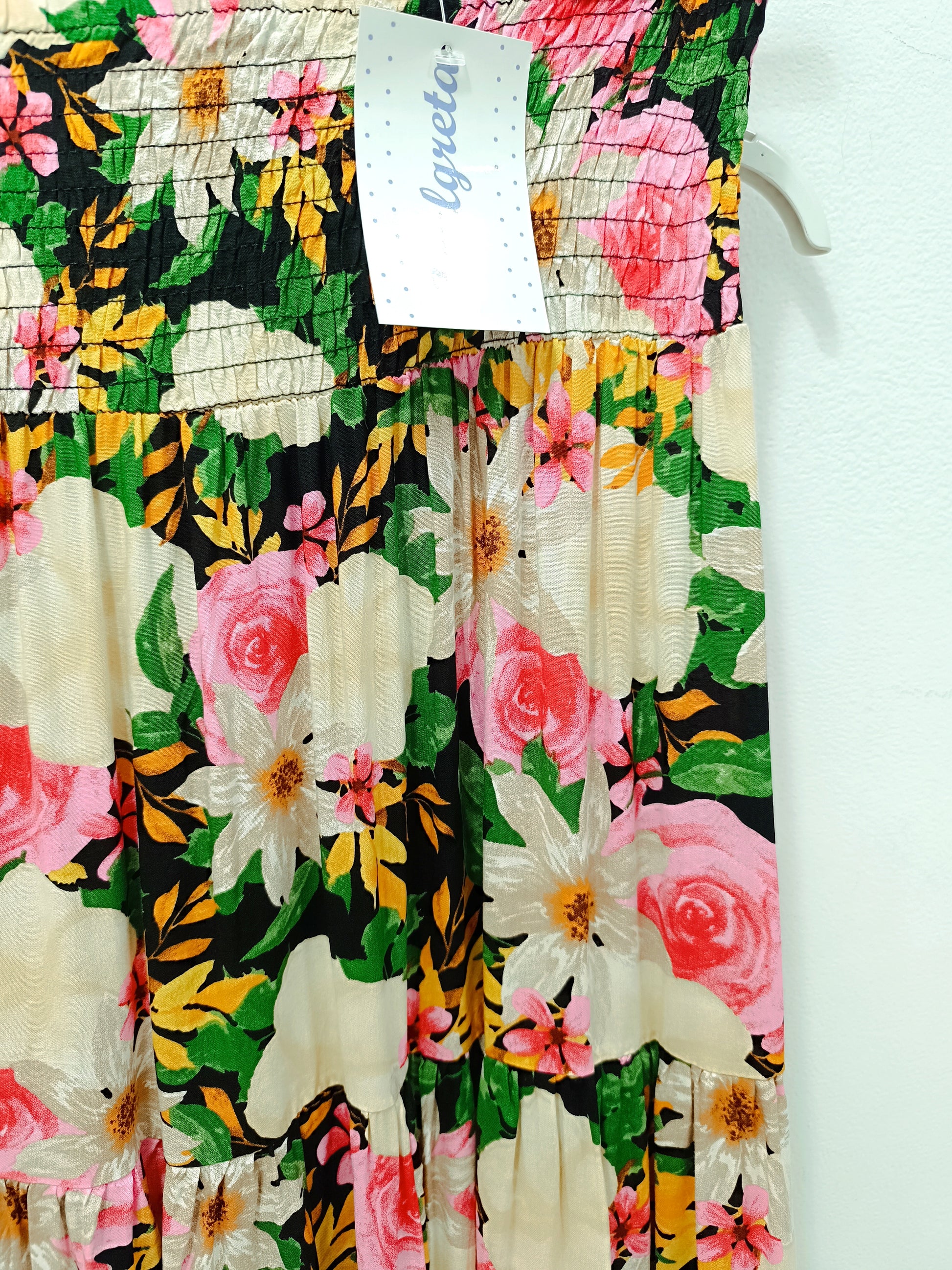 La falda Gabriela es una prenda imprescindible para el verano, con un fondo negro que resalta las grandes flores de colores vibrantes, creando un look fresco y lleno de vida. Su diseño de vuelo y largo la convierten en una opción elegante y cómoda, ideal para los días soleados. La cinturilla elástica ofrece un ajuste cómodo y favorecedor, mientras que su estilo colorido aporta un toque alegre y moderno. Disponible en tallas S/M, M/L y L/XL, esta falda es perfecta para un look veraniego, lleno de estilo y dinamismo.