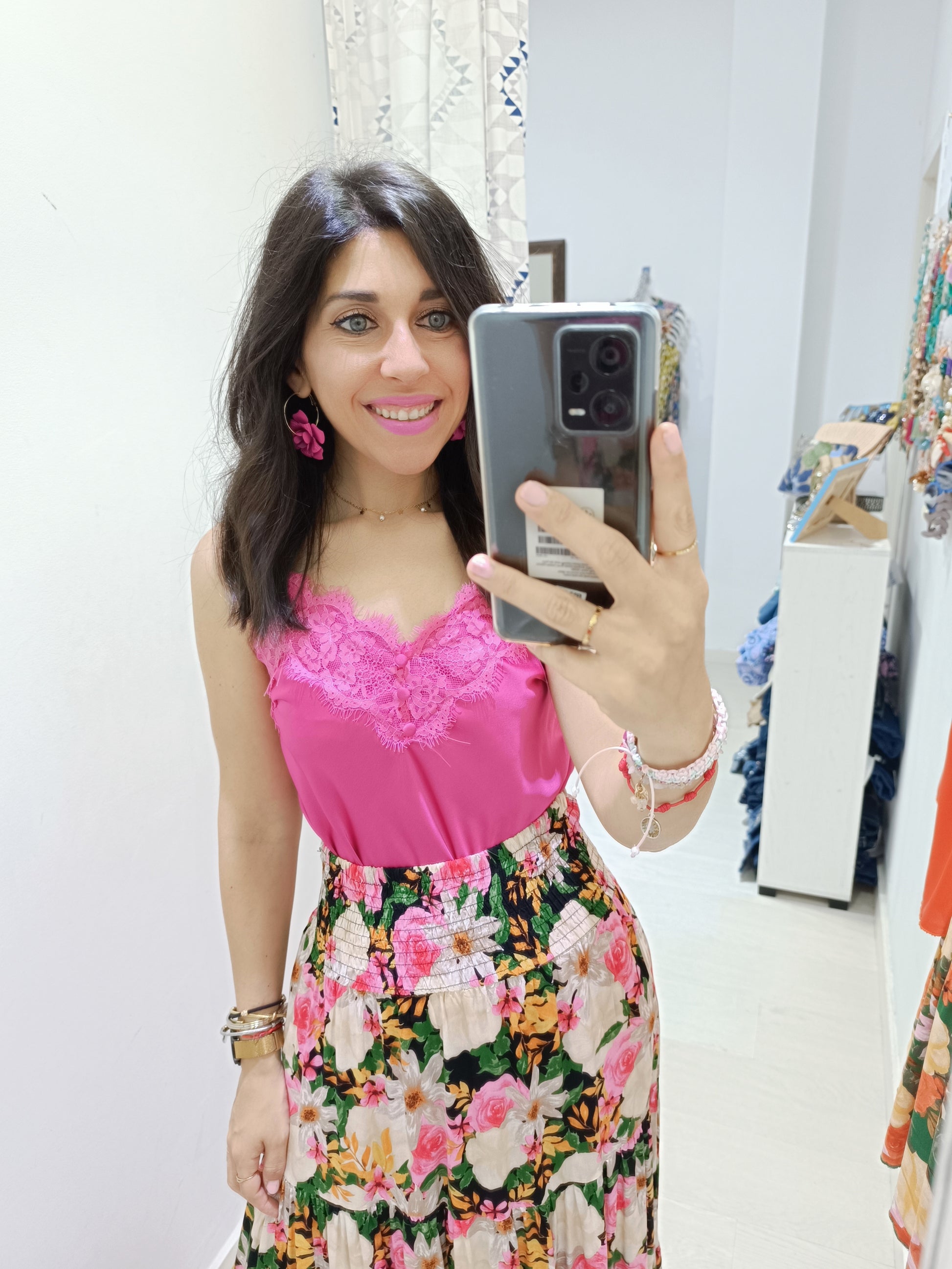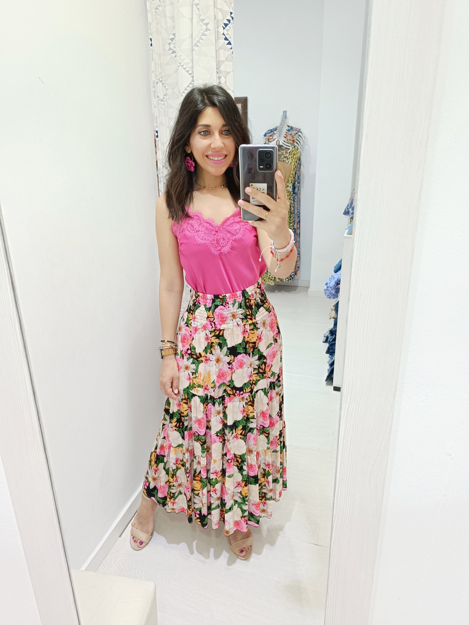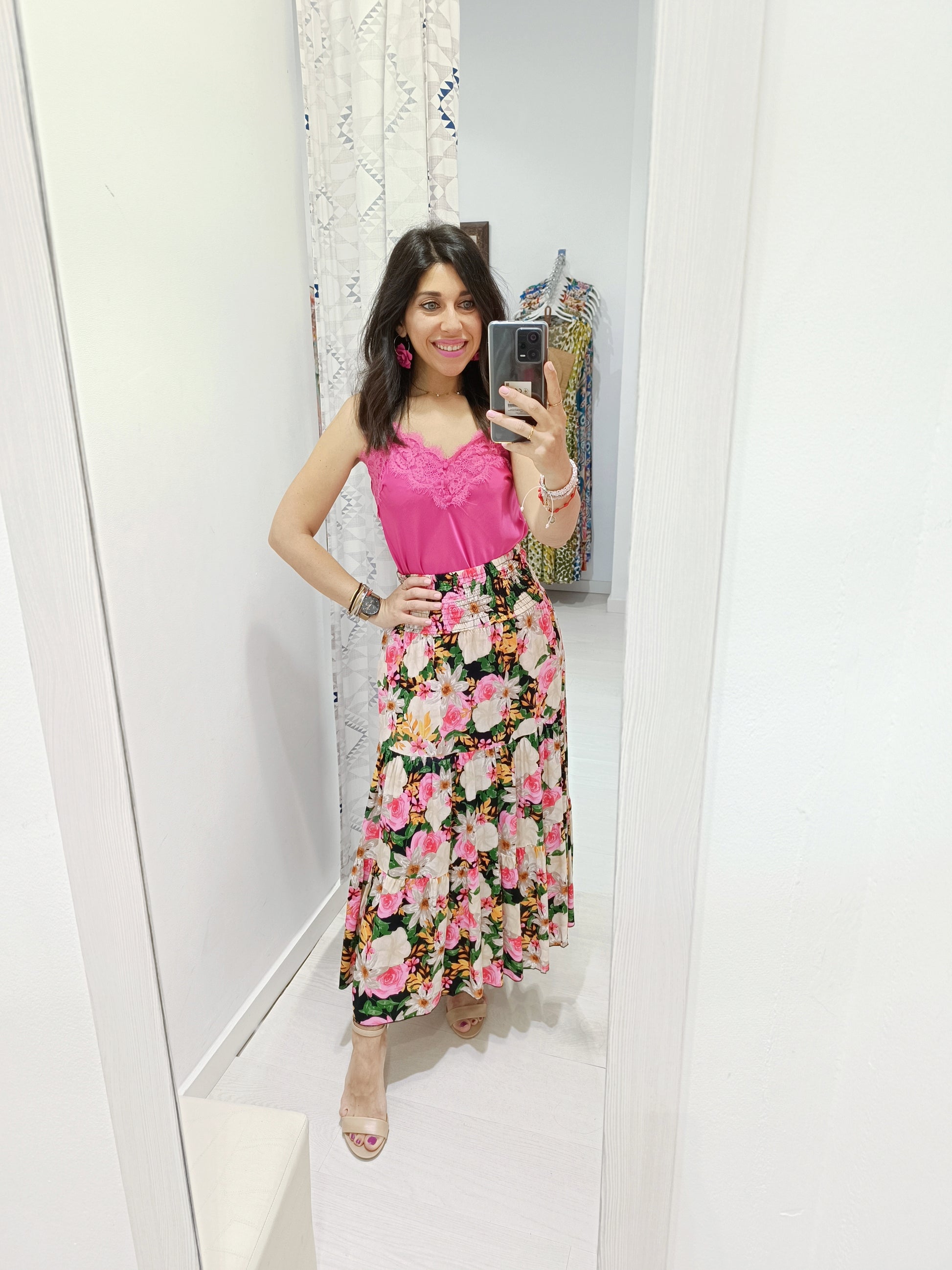 La falda Gabriela es una prenda imprescindible para el verano, con un fondo negro que resalta las grandes flores de colores vibrantes, creando un look fresco y lleno de vida. Su diseño de vuelo y largo la convierten en una opción elegante y cómoda, ideal para los días soleados. La cinturilla elástica ofrece un ajuste cómodo y favorecedor, mientras que su estilo colorido aporta un toque alegre y moderno. Disponible en tallas S/M, M/L y L/XL, esta falda es perfecta para un look veraniego, lleno de estilo y dinamismo.