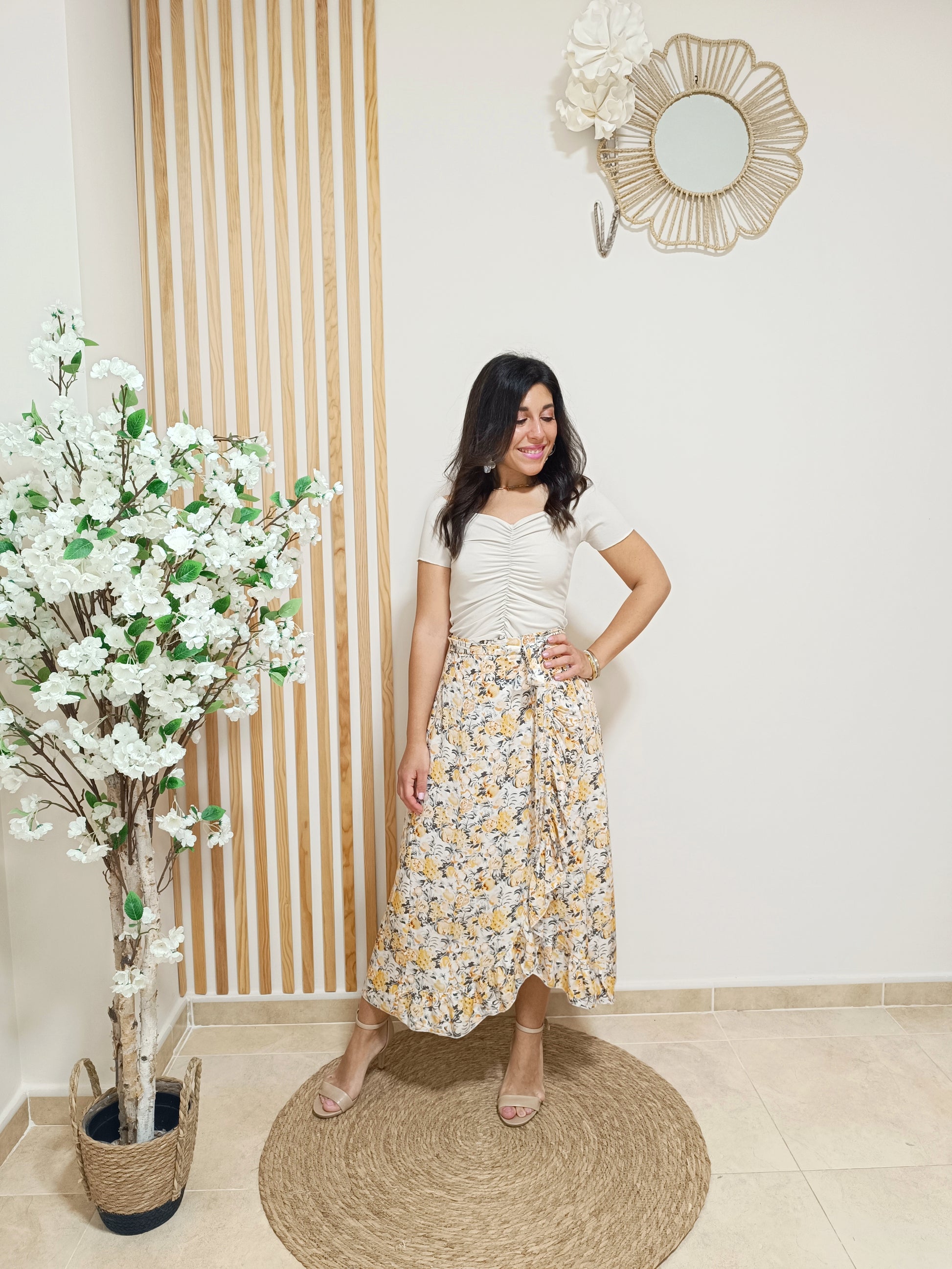 Si estás buscando una falda que sea una prenda todoterreno para cualquier hora del día, favorecedora y súper fácil de combinar con tus camisetas más neutras, entonces, ¡enhorabuena, amiga! porque la has encontrado. Te presentamos la falda Loreto con un estampado de flores que podrás elegir en tonos beige, verdes o multicolor.