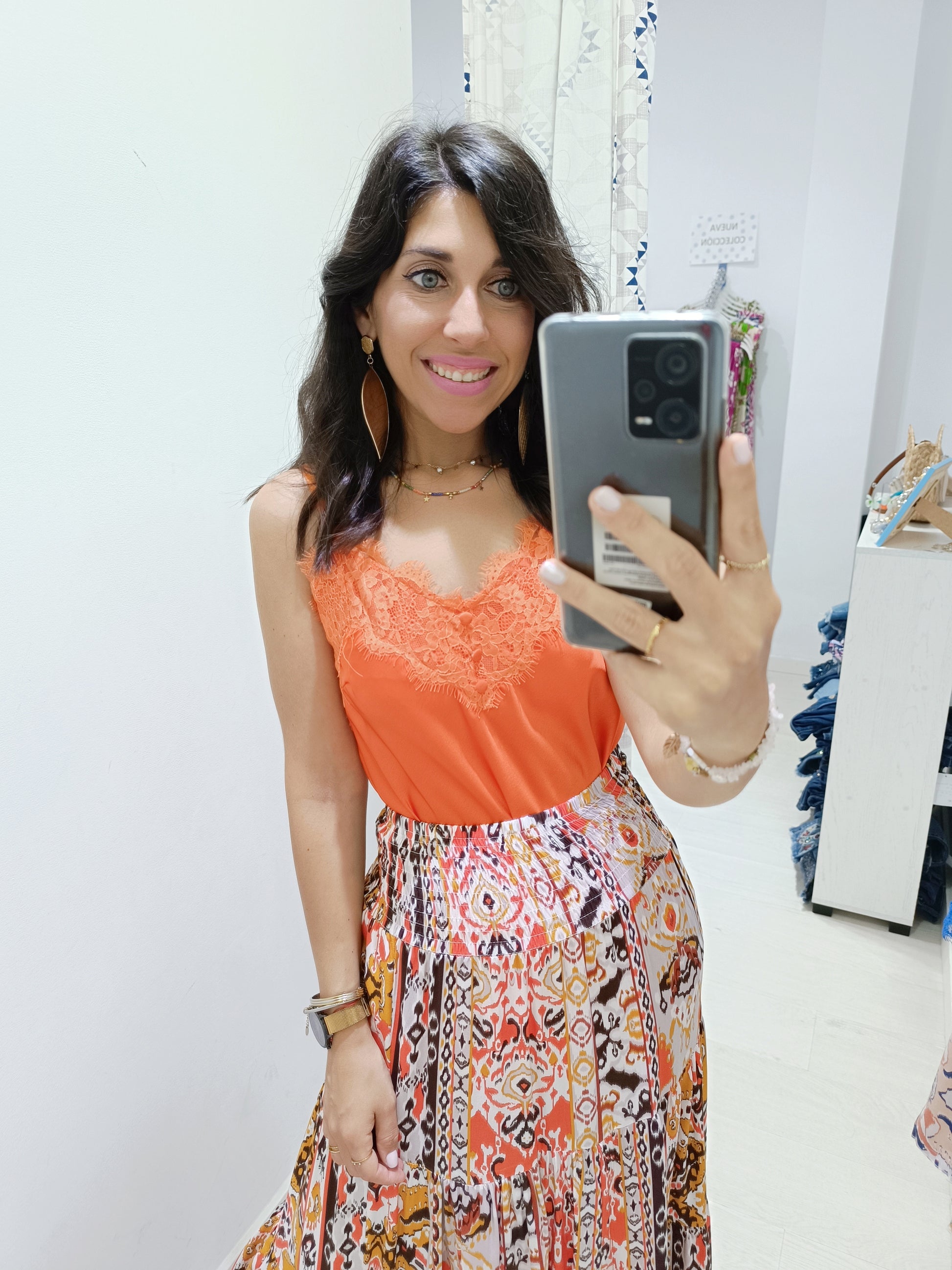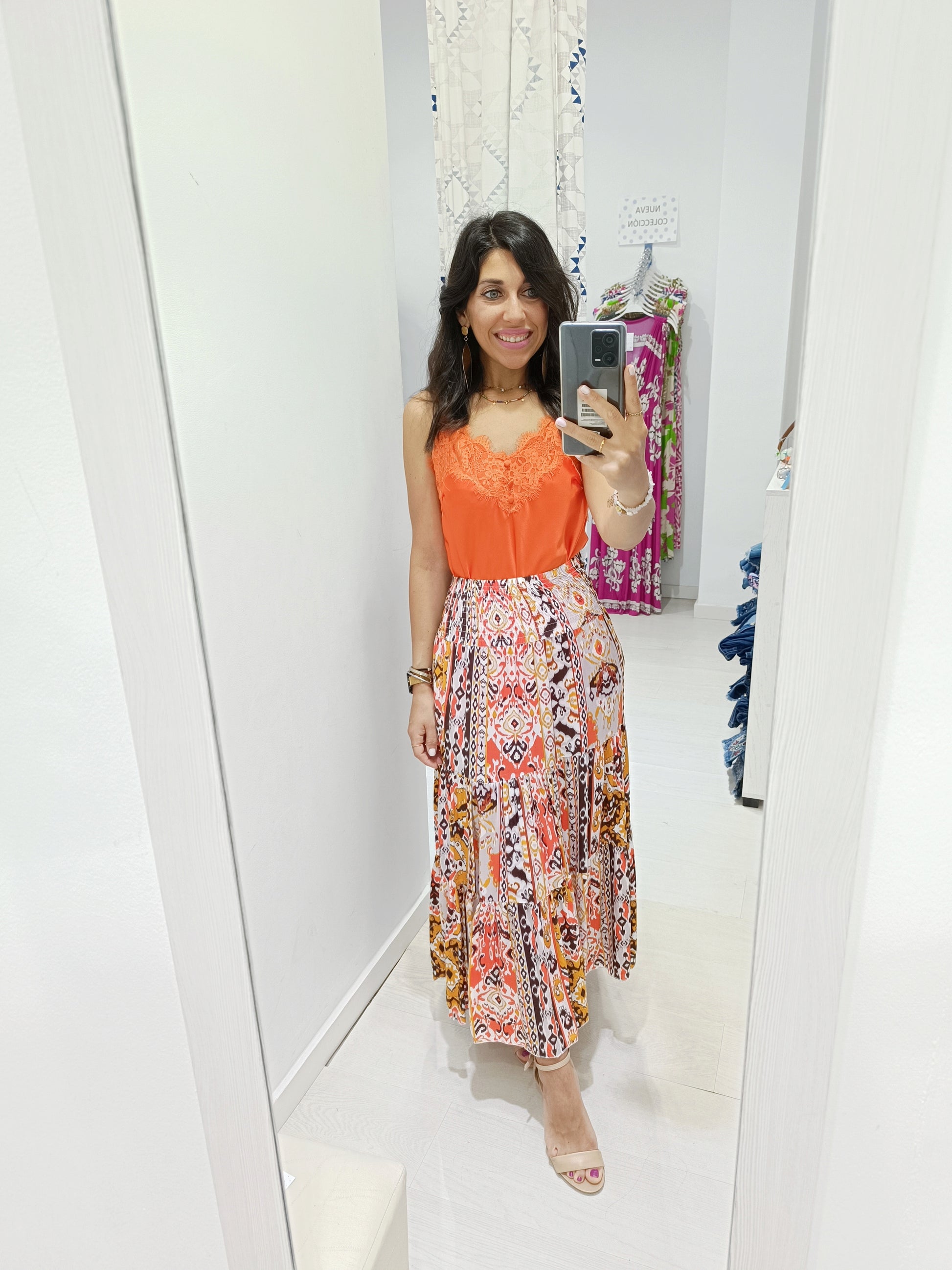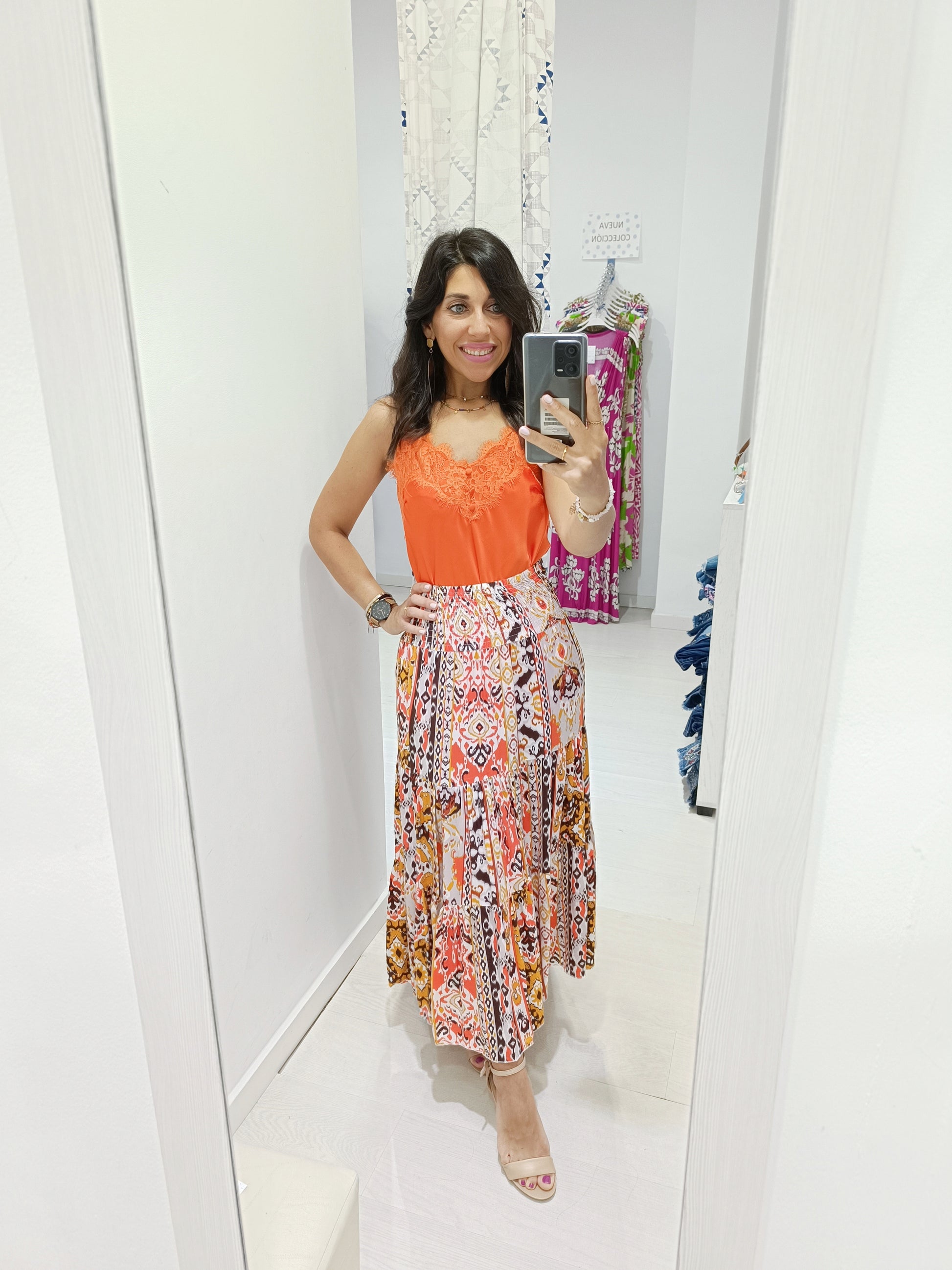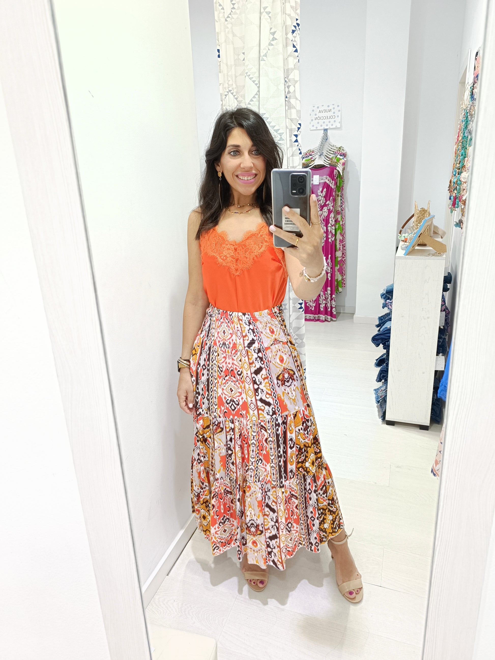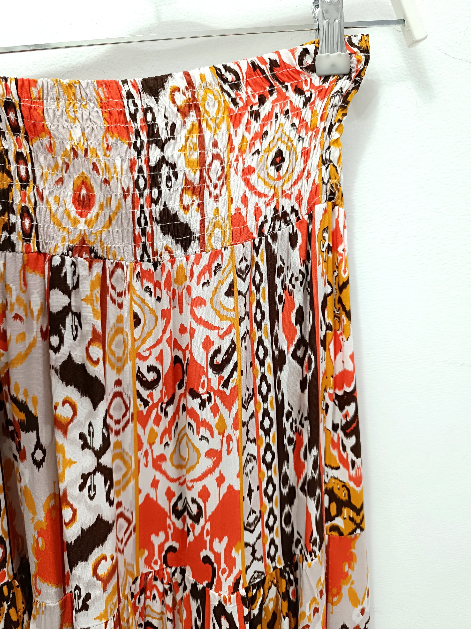 La falda Petra es una prenda perfecta para quienes buscan un estilo boho y hippy chic. Con un diseño de vuelo que aporta movimiento y fluidez, esta falda en colores cálidos como ocres y rojos evoca una sensación de frescura y naturalidad.