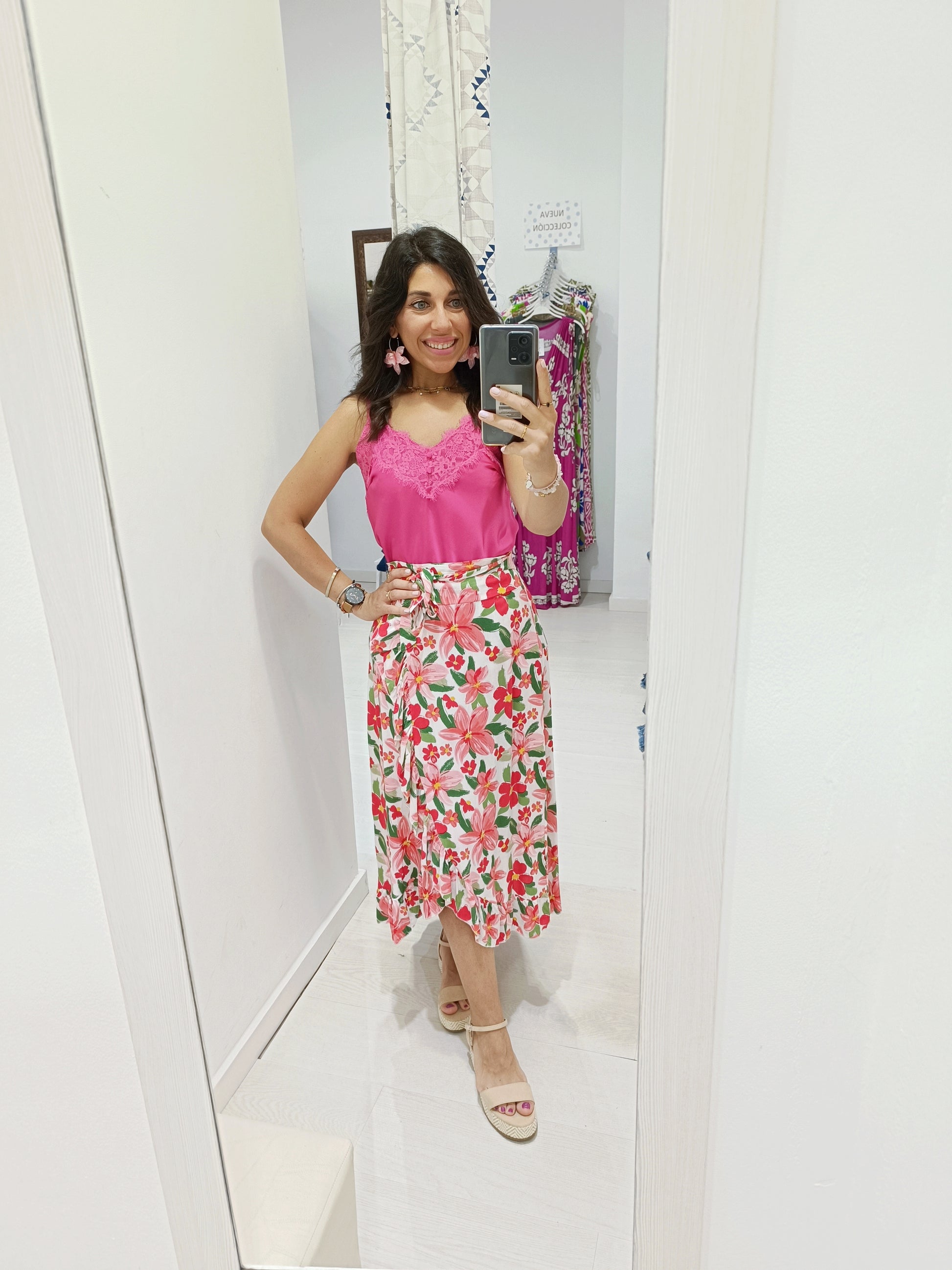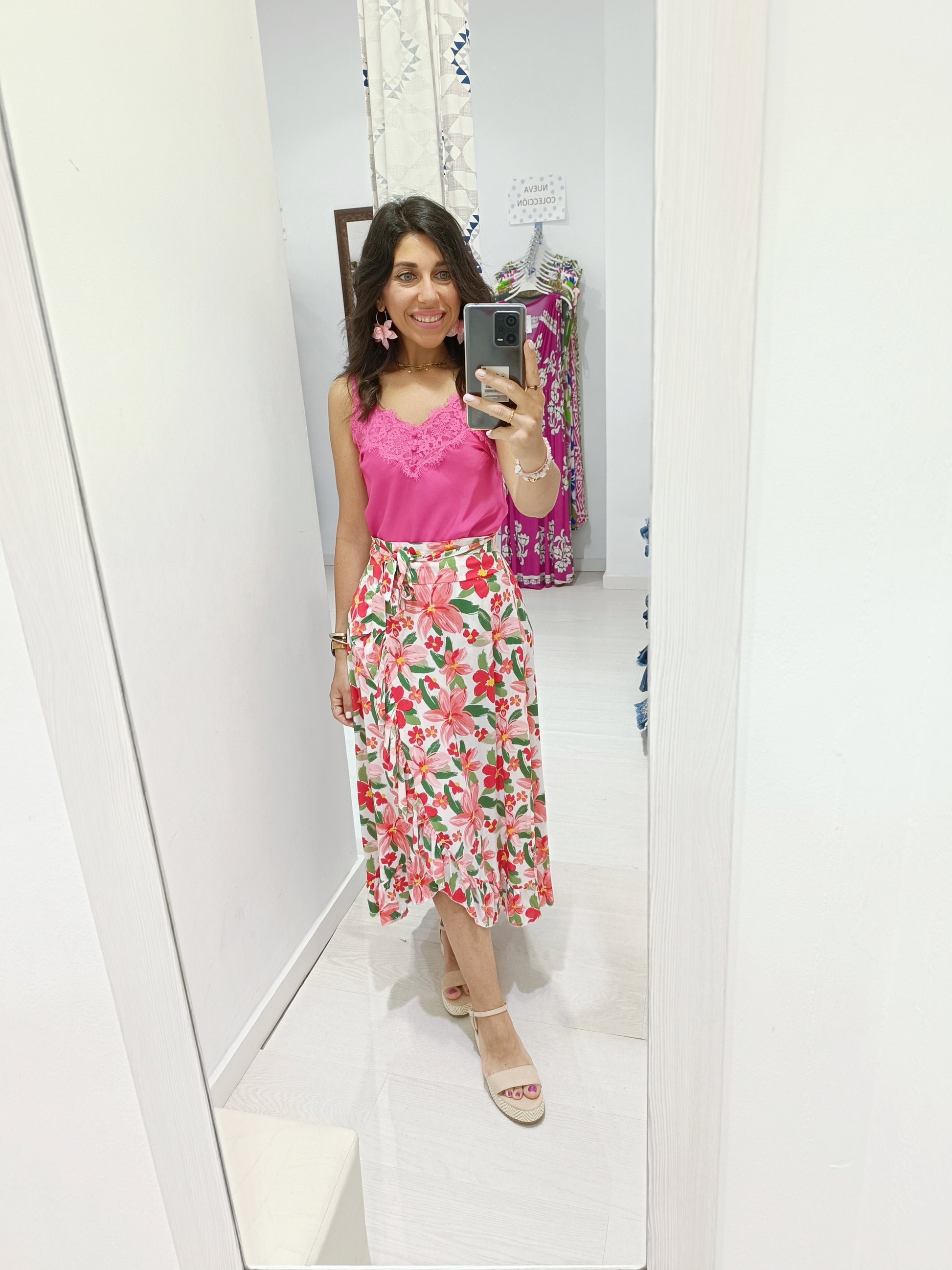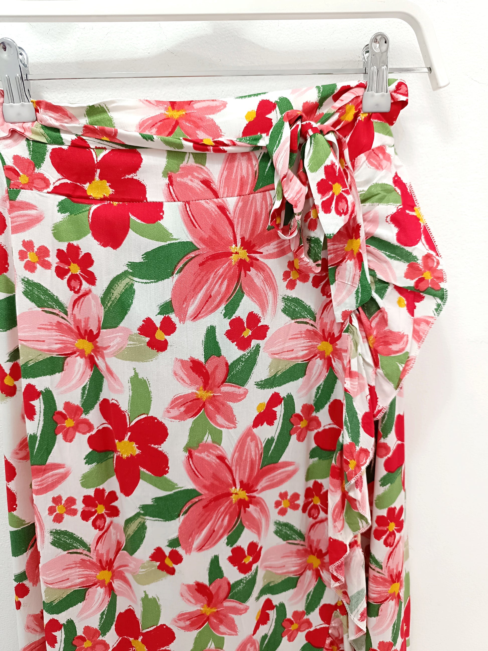 La falda Bombay es una prenda ideal para los días más cálidos, gracias a su estampado floral colorido que aporta un aire fresco y veraniego. Su corte pareo con largo asimétrico crea un diseño dinámico y elegante, mientras que la lazada a modo de cinturón permite ajustarla perfectamente a la cintura. La cinturilla engomada asegura comodidad durante todo el día. Disponible en tallas S/M, M/L y L/XL, es perfecta para crear un look relajado y estiloso, ideal para disfrutar del buen tiempo con elegancia.