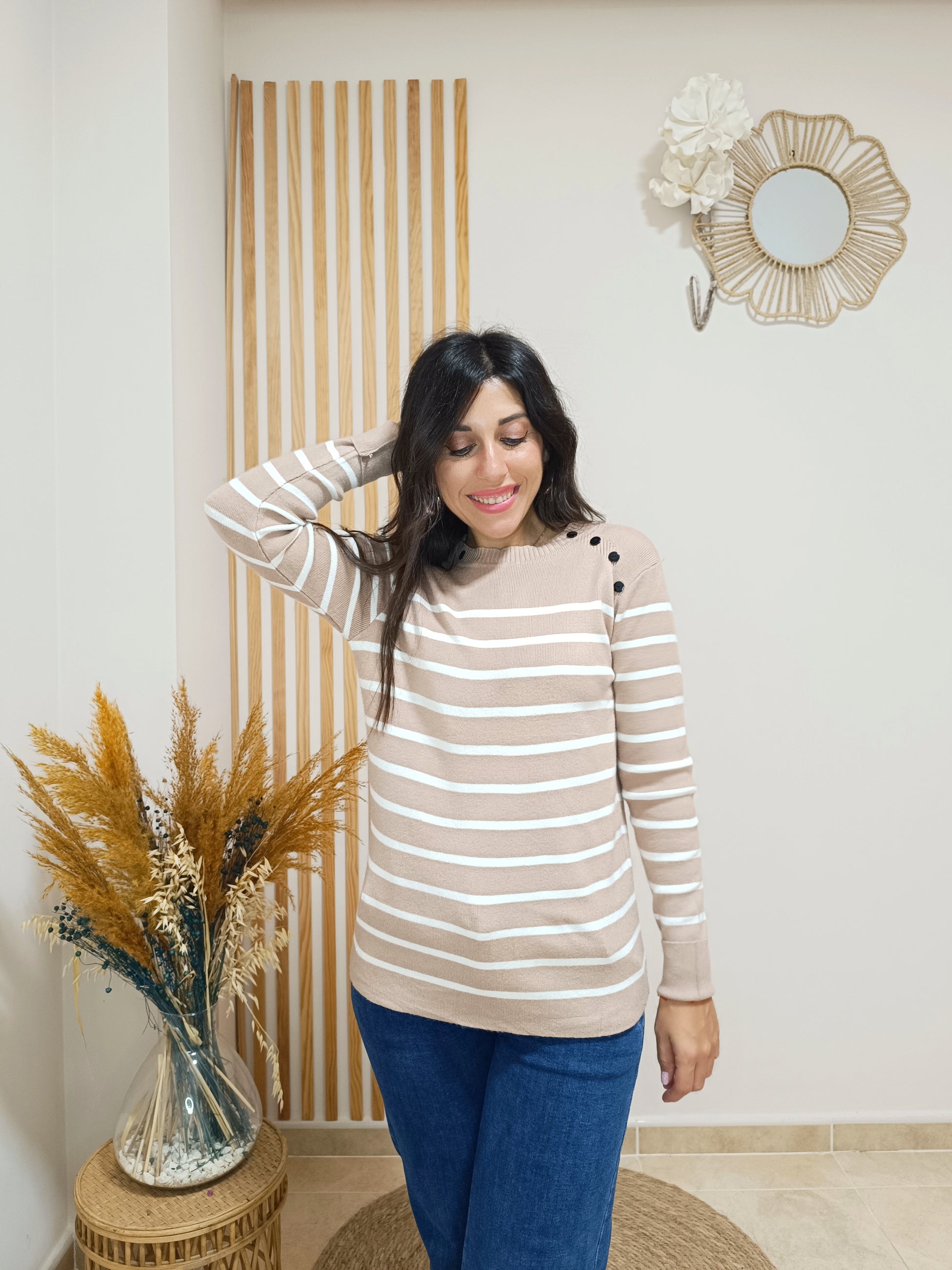 Nuestro jersey Diana combina unas rayas finitas sobre 4 colores de fondo entre los que podrás elegir: blanco, cámel, azul marino o granate. El detalle de los botones en la parte superior de ambos hombros le aporta un toque de lo más original.
