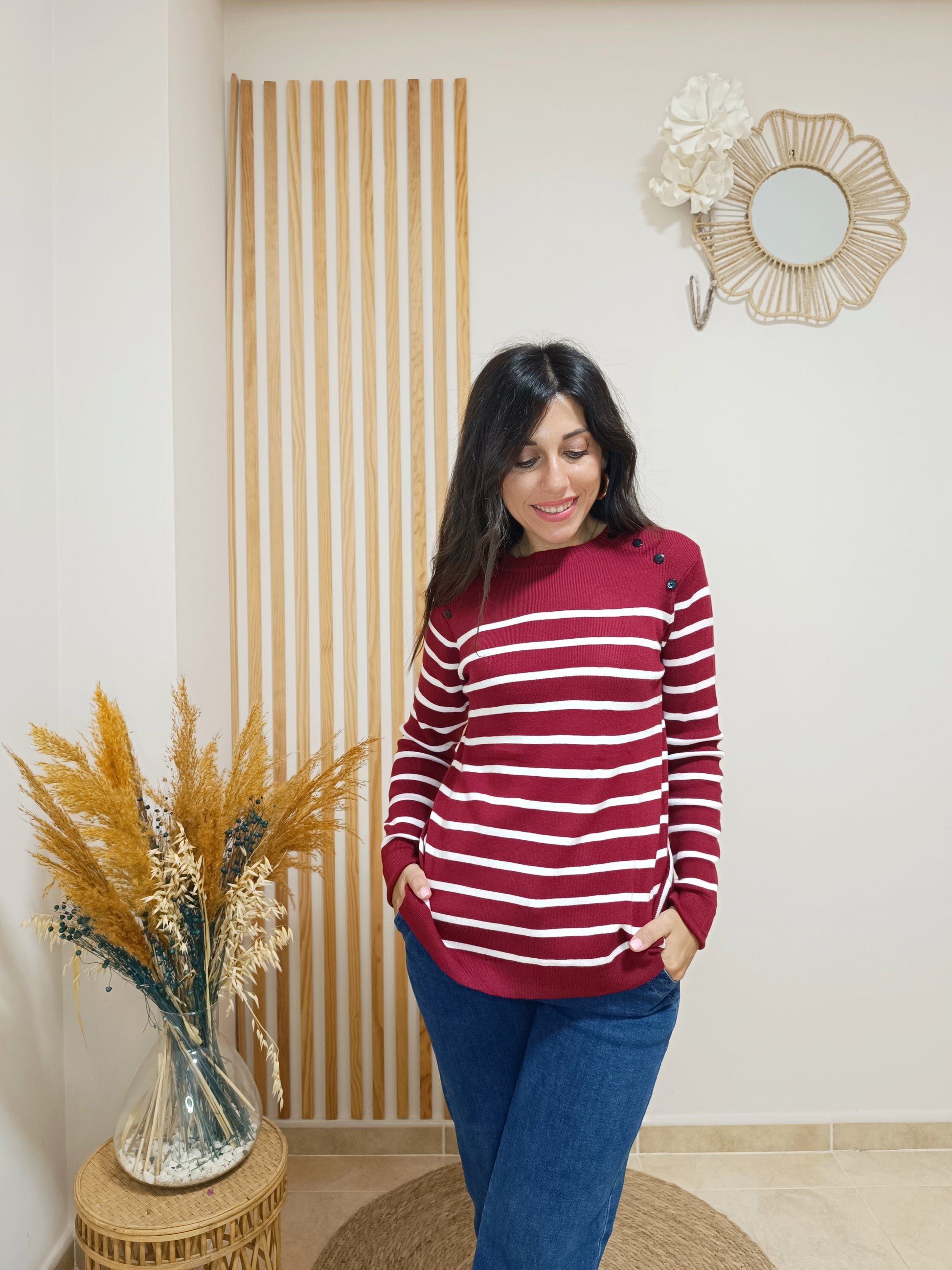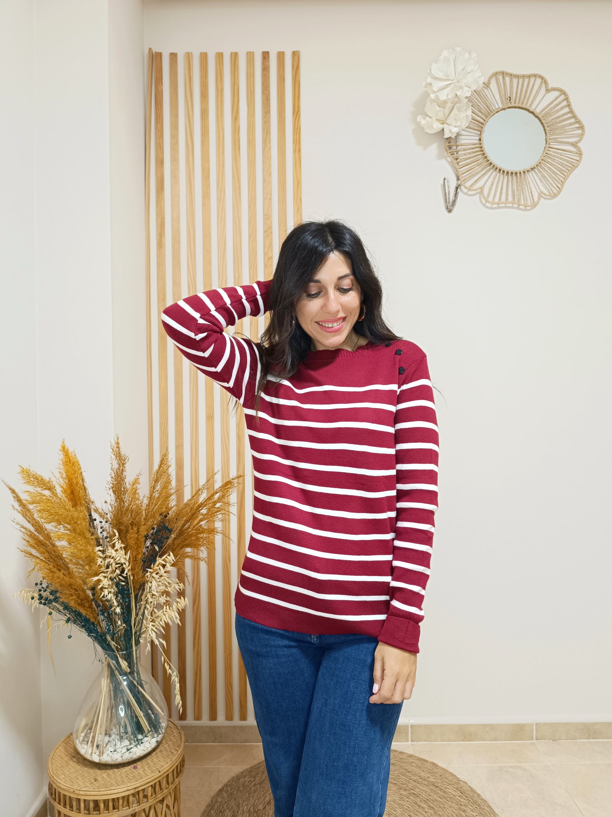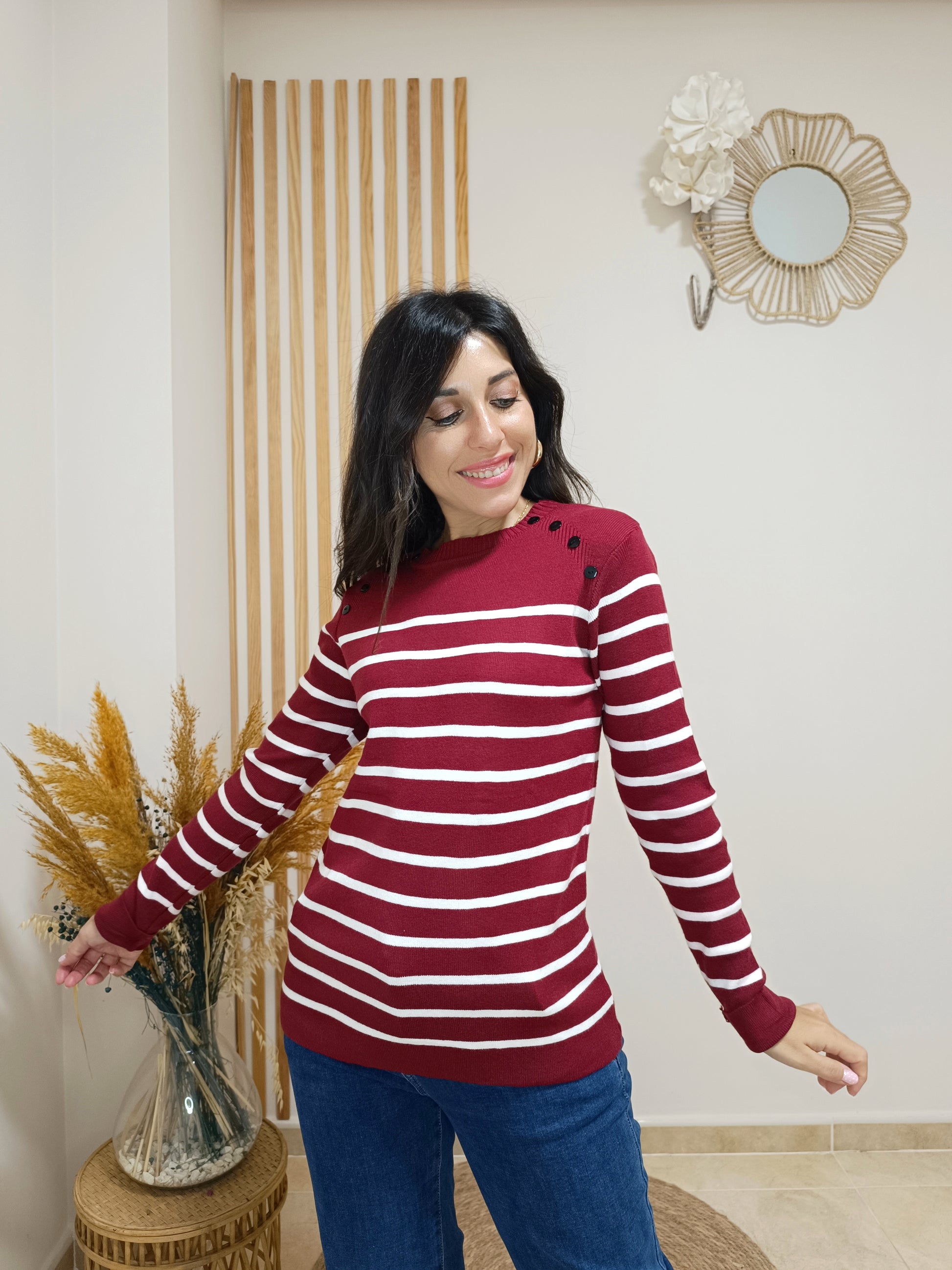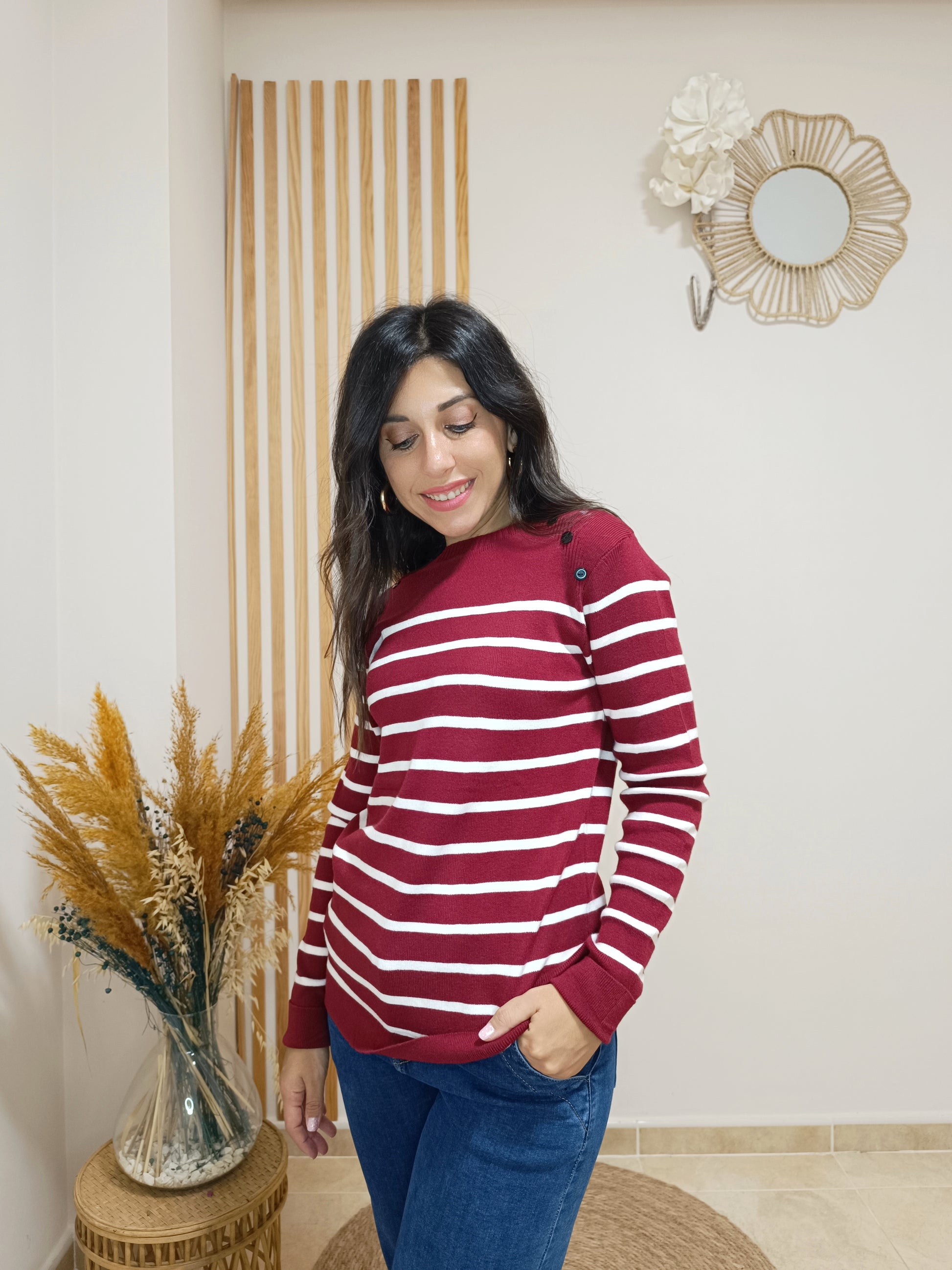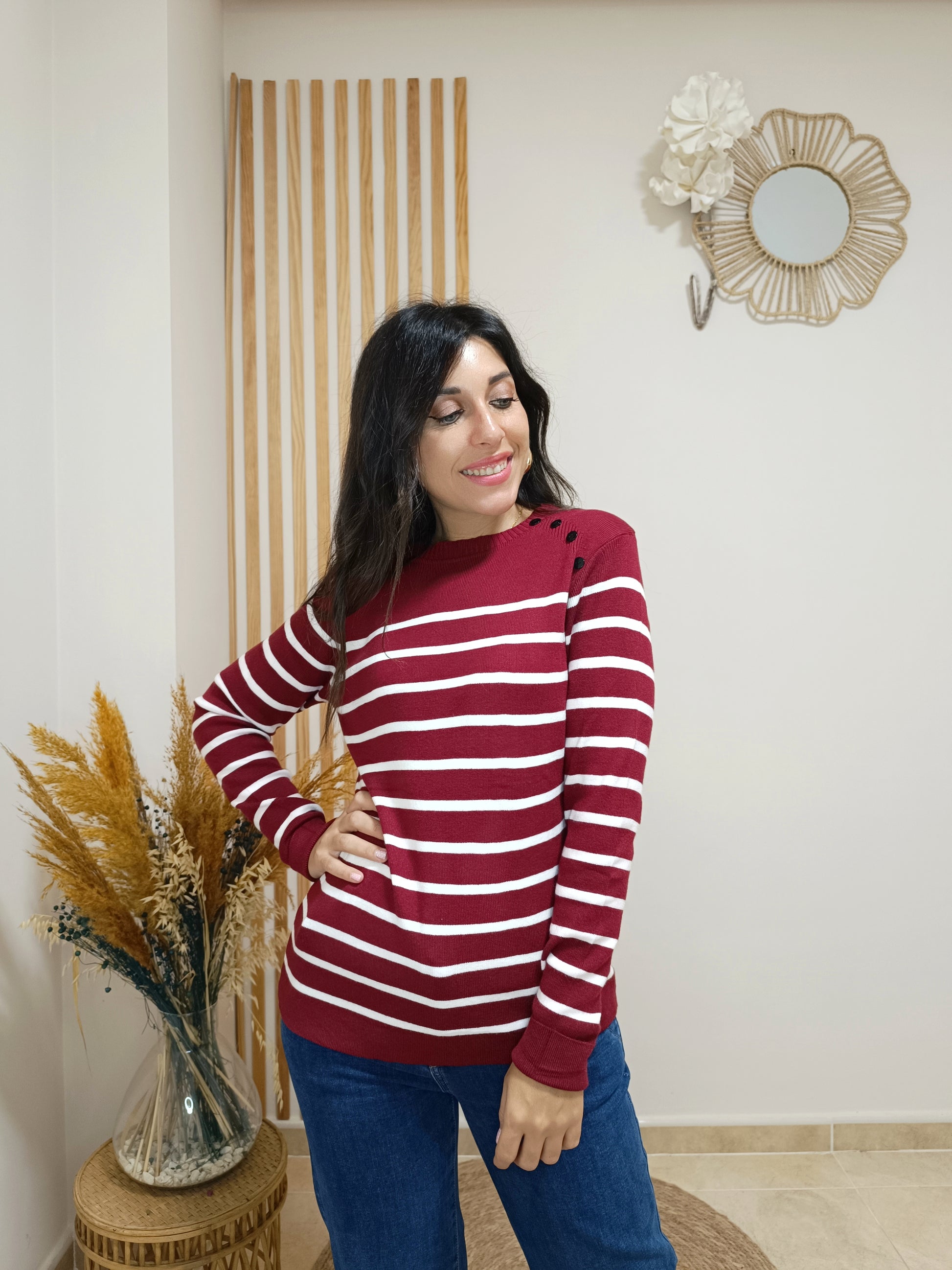 Nuestro jersey Diana combina unas rayas finitas sobre 4 colores de fondo entre los que podrás elegir: blanco, cámel, azul marino o granate. El detalle de los botones en la parte superior de ambos hombros le aporta un toque de lo más original.