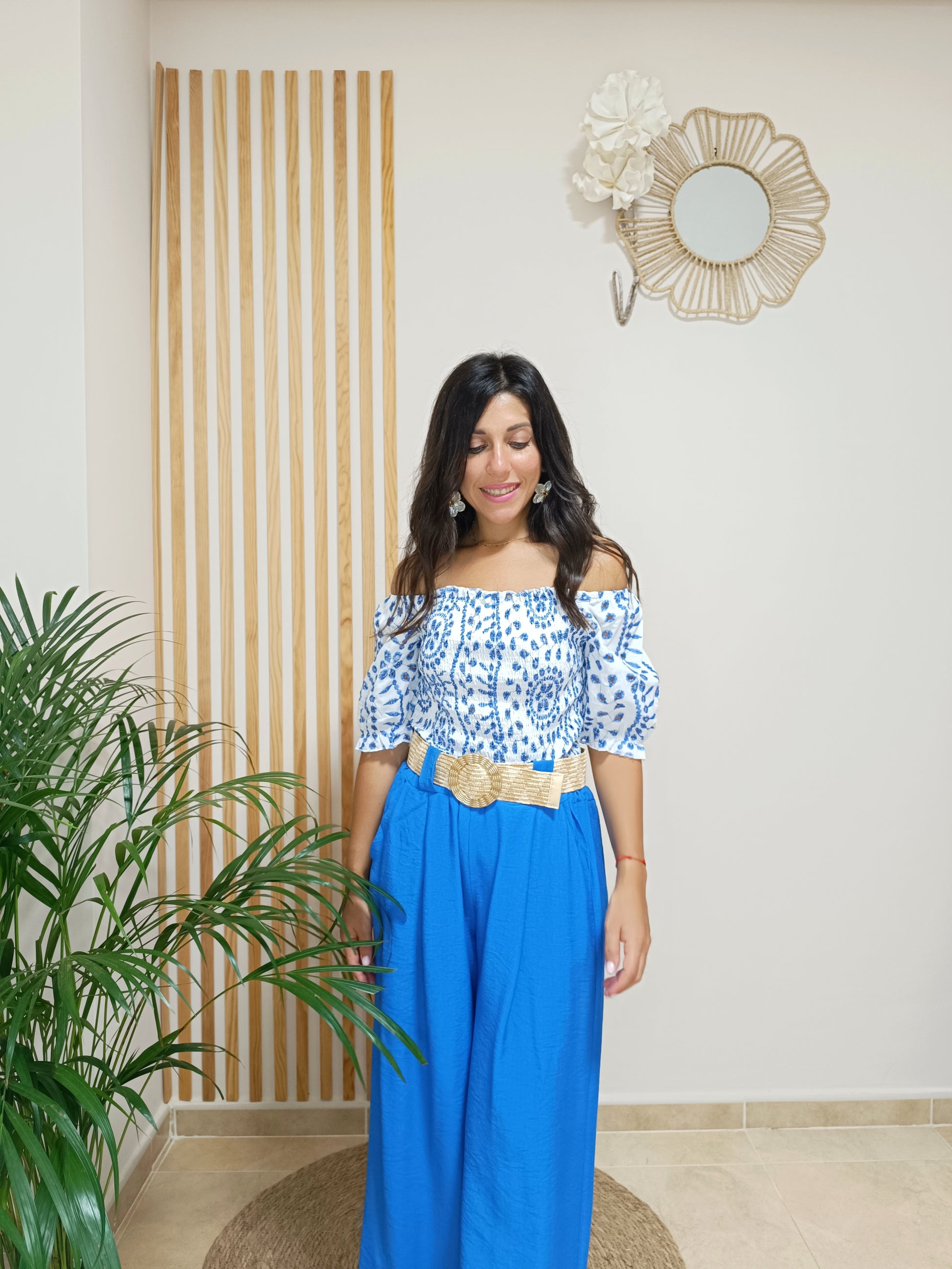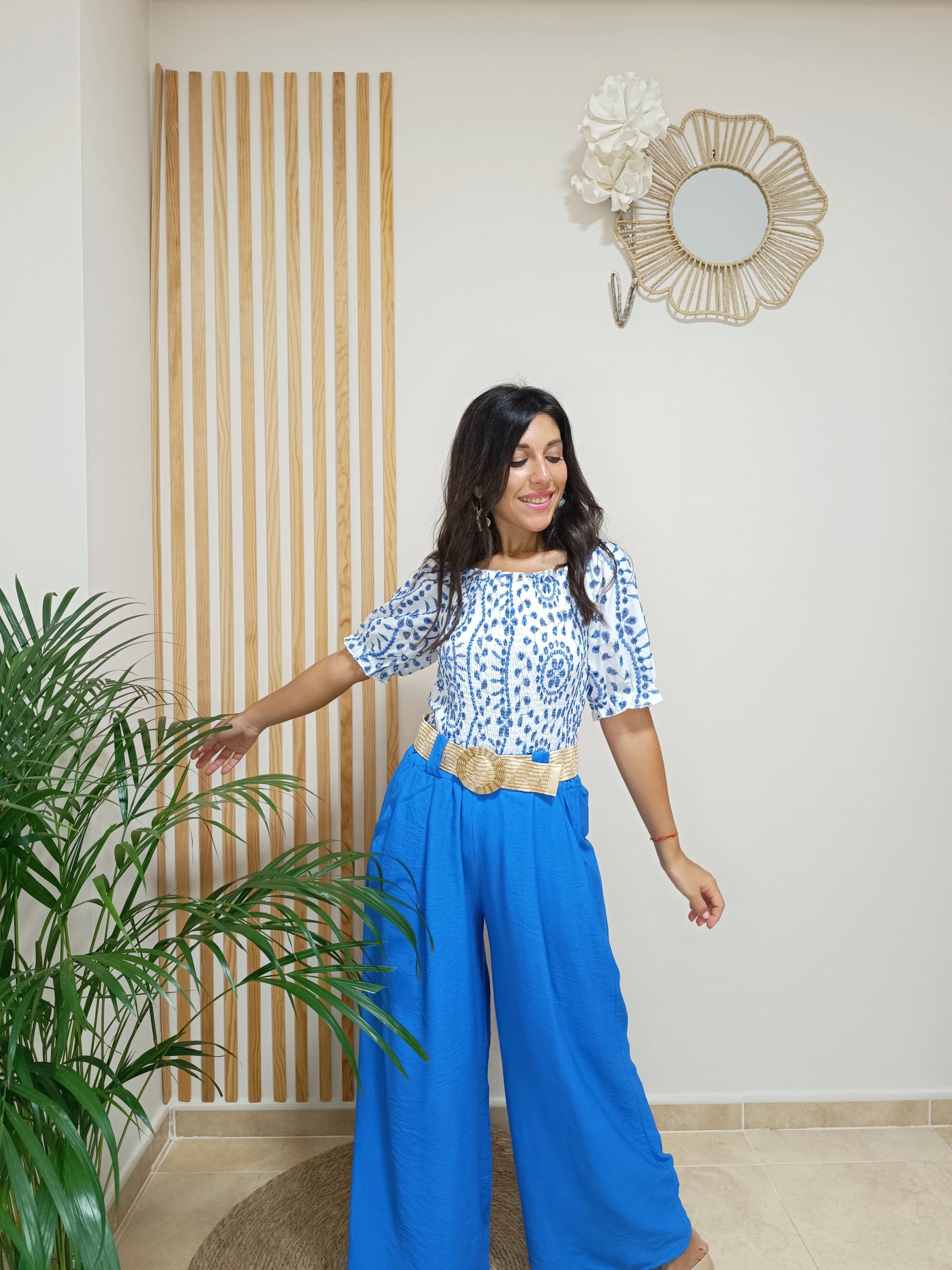 Con un majestuoso largo palazzo, su pata es totalmente recta con caída para aportar fluidez a tus movimientos. Su cinturilla es totalmente elástica y con tiro alto para resaltar tu silueta con el cinturón de rafia que lo acompaña. Sus dos pinzas por la parte delantera le añaden ese toque chic y sofisticado que siempre eleva nuestros looks con pantalón.