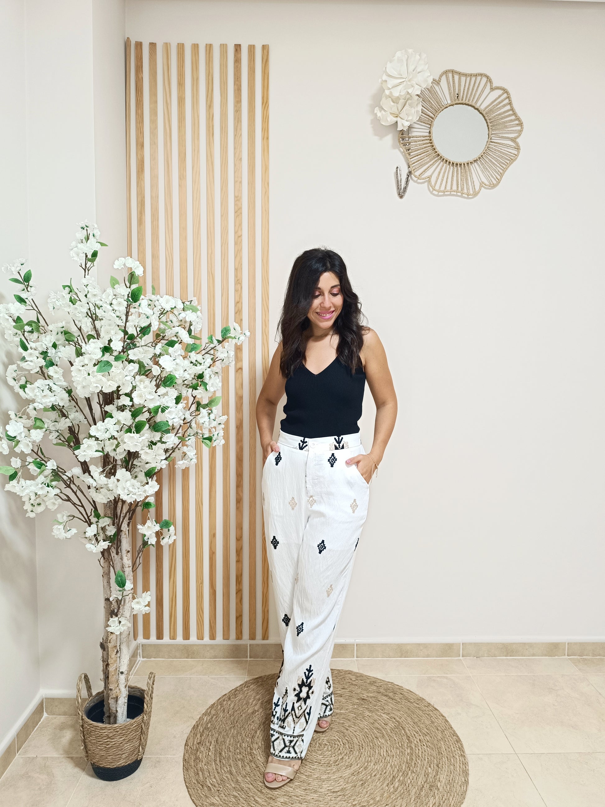Si estás buscando un pantalón fresquito y cómodo para los días de calor, que sea súper combinable y que te sirva para looks 24 horas... Ya puedes respirar tranquila porque lo hemos encontrado. Te presentamos el pantalón Mumbai. Con un discreto estampado en motivos tribales bordados en lino, puedes elegirlo con el fondo blanco o beige. La cinturilla es totalmente elástica por la parte trasera, por lo que podrás ajustarlo con más facilidad.