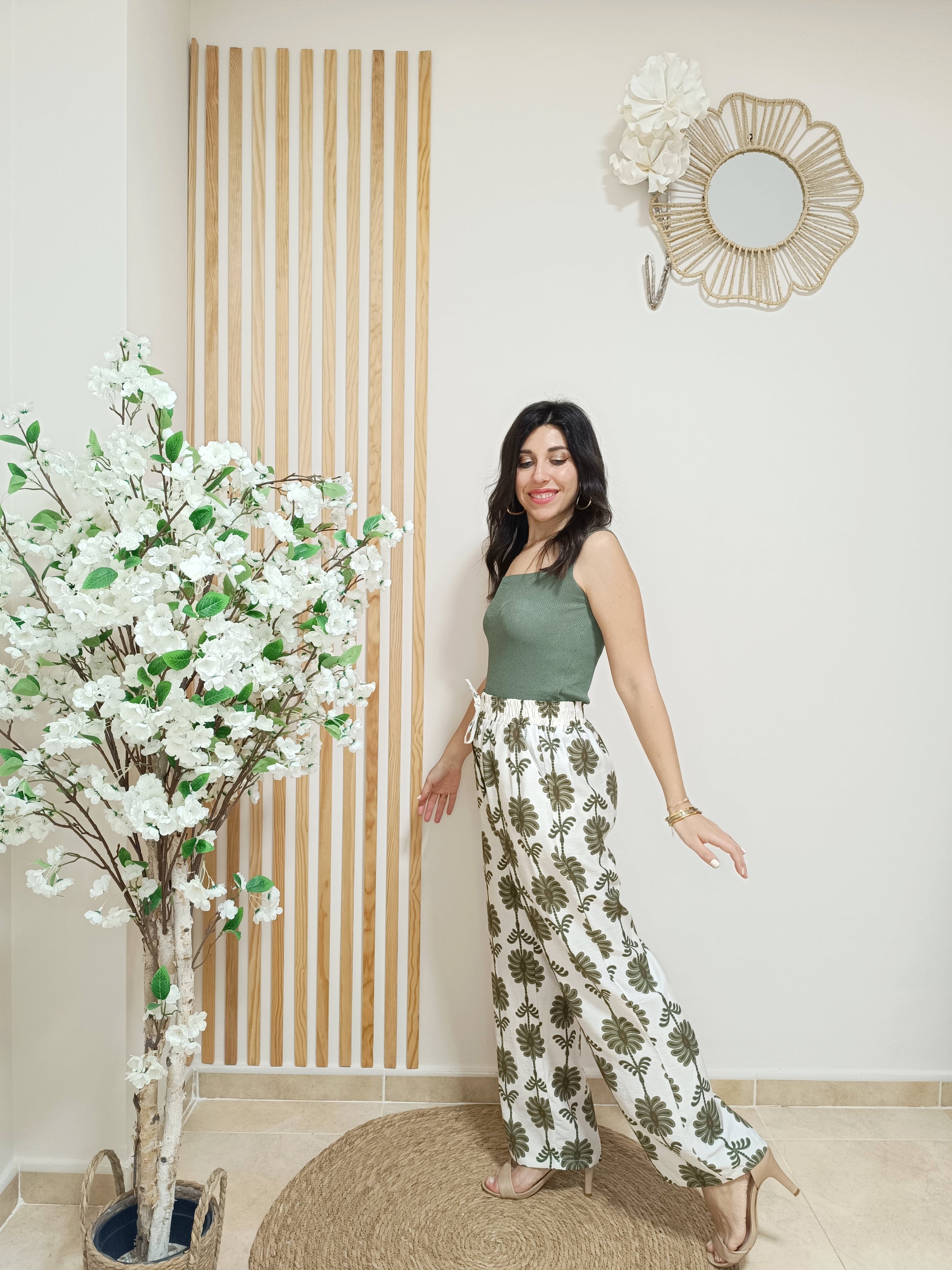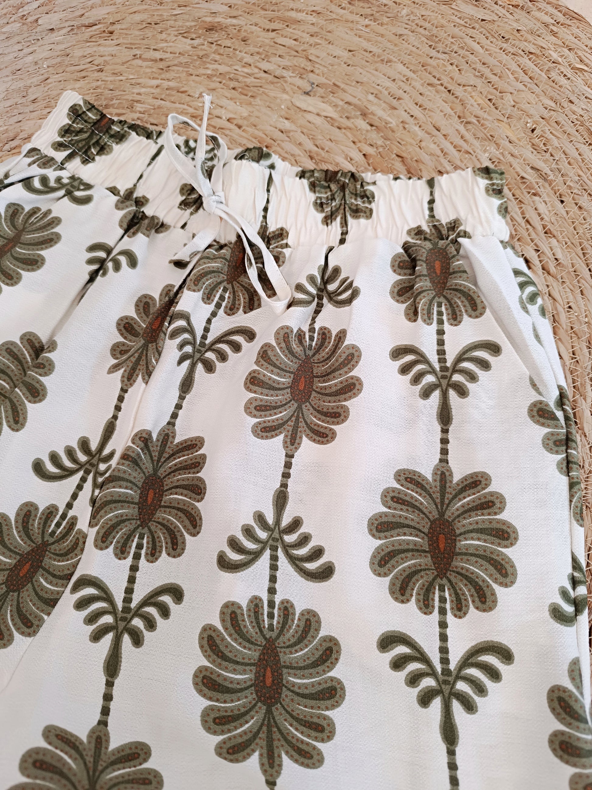En un elegante color beige de fondo, el pantalón Tanis está disponible con el estampado en tono marrón o verde caqui. Con cinturilla totalmente rizada, es una prenda de corte fluido, con pata ancha.