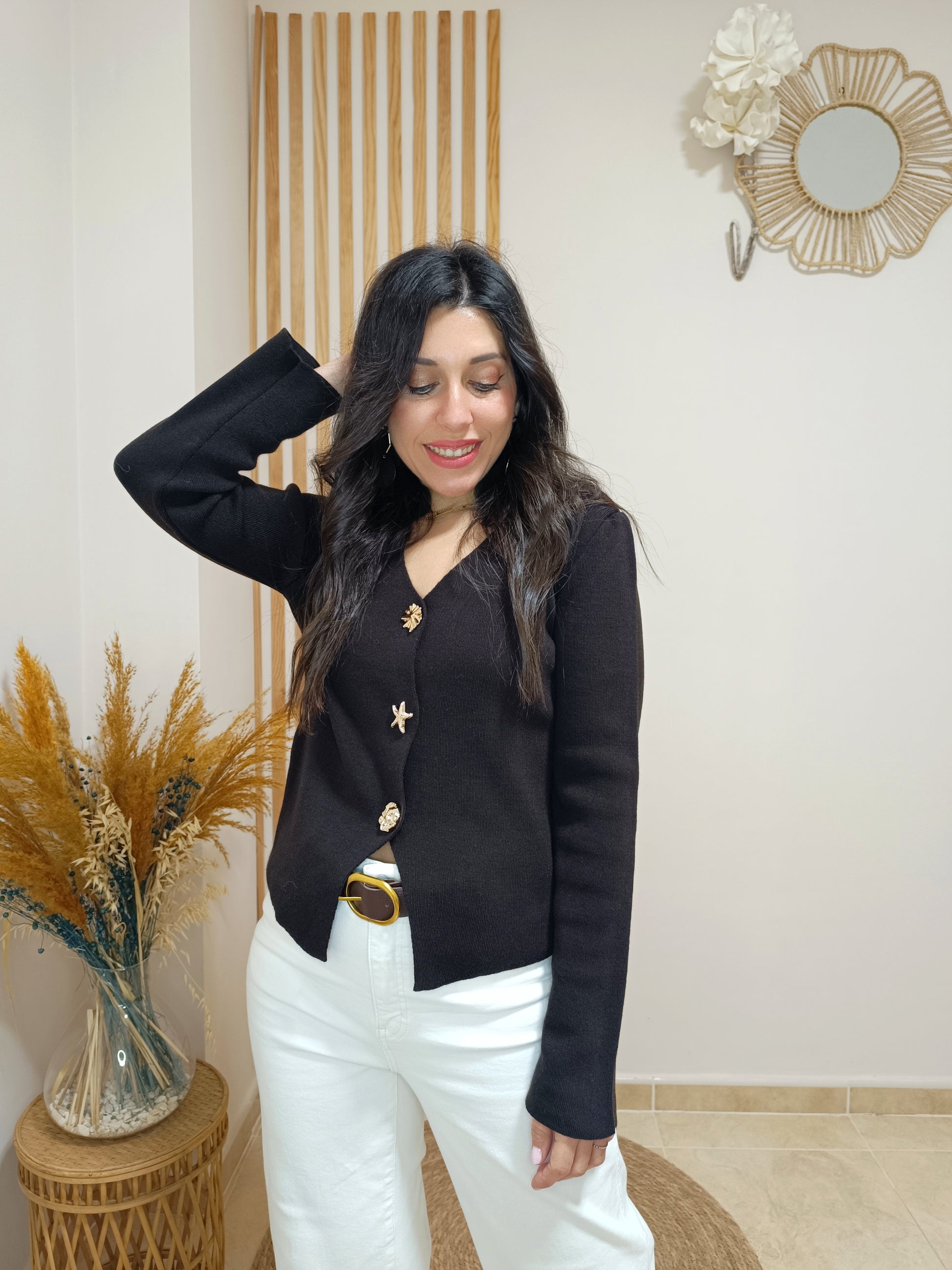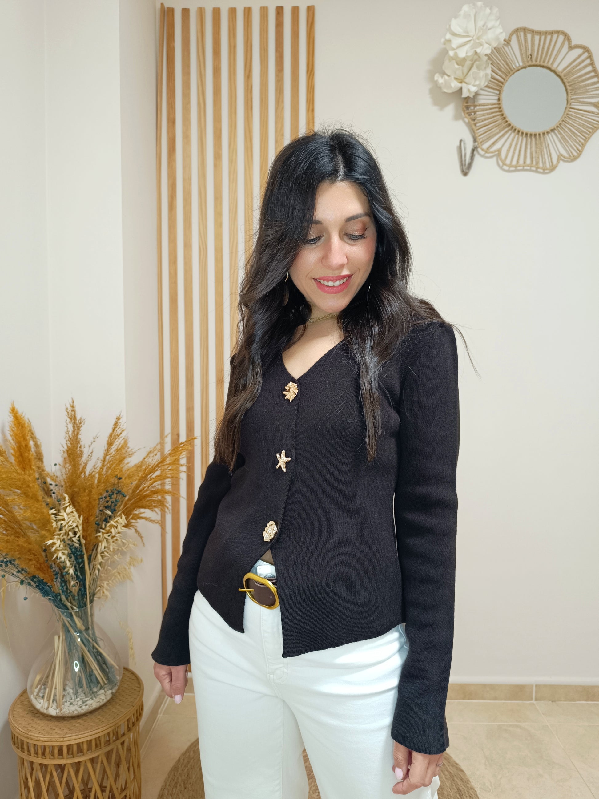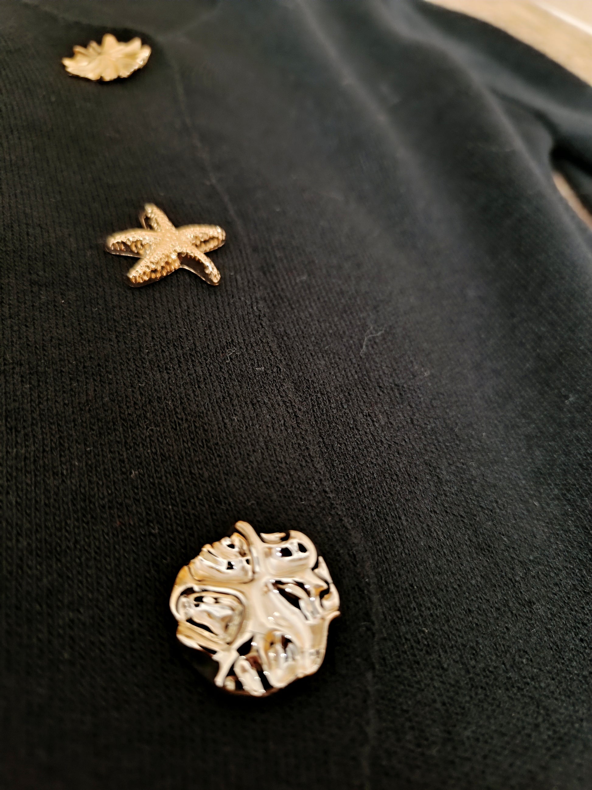 Nuestro top Ariel te encantará por sus originales maxibotones dorados con formas, uno de ellos simula una estrellita de mar de lo más ideal. ¿Lo mejor? Pues que podrás quitarlos y ponerlos sobre la prenda que quieras, ya que son broches con imperdible.