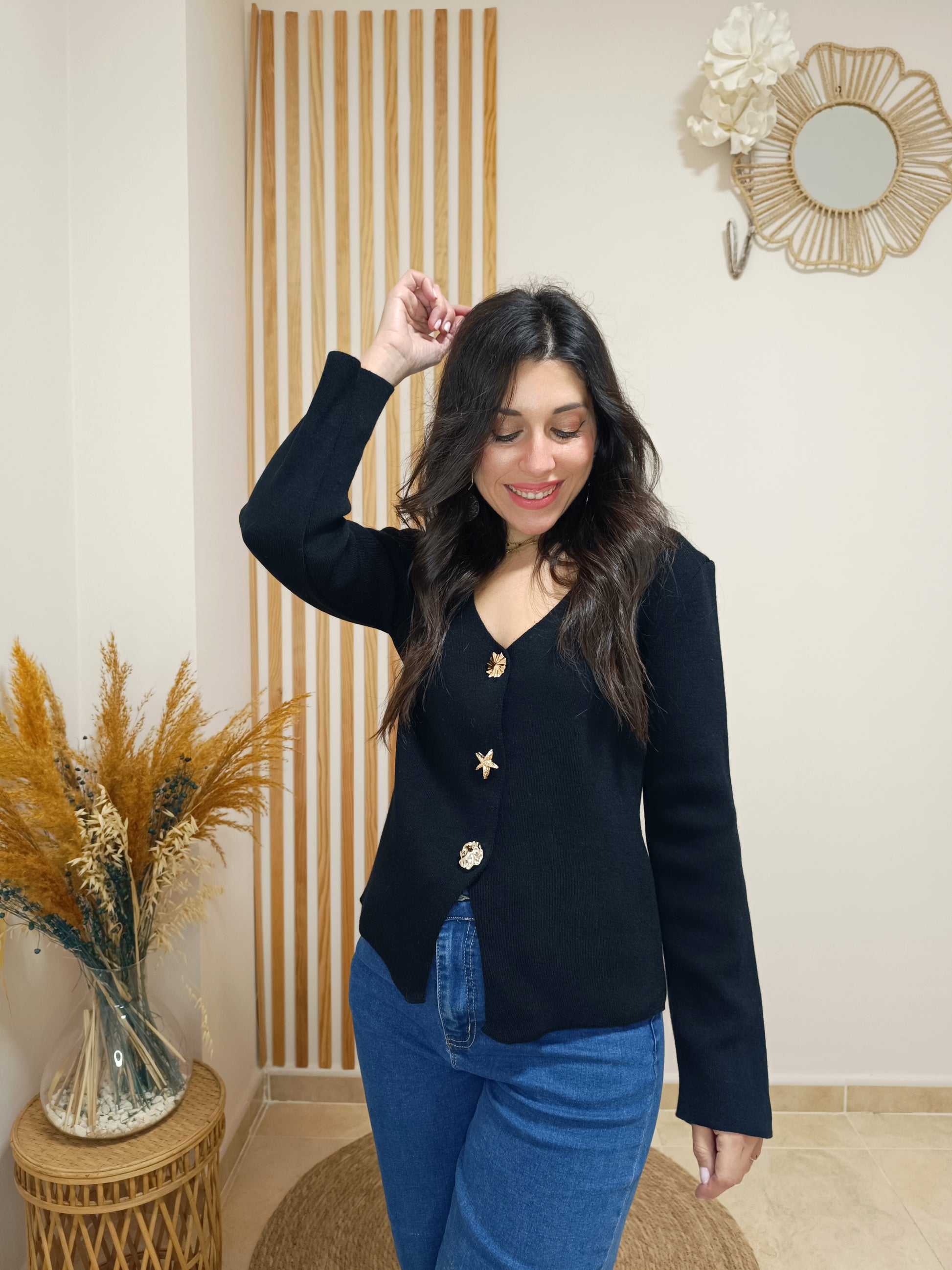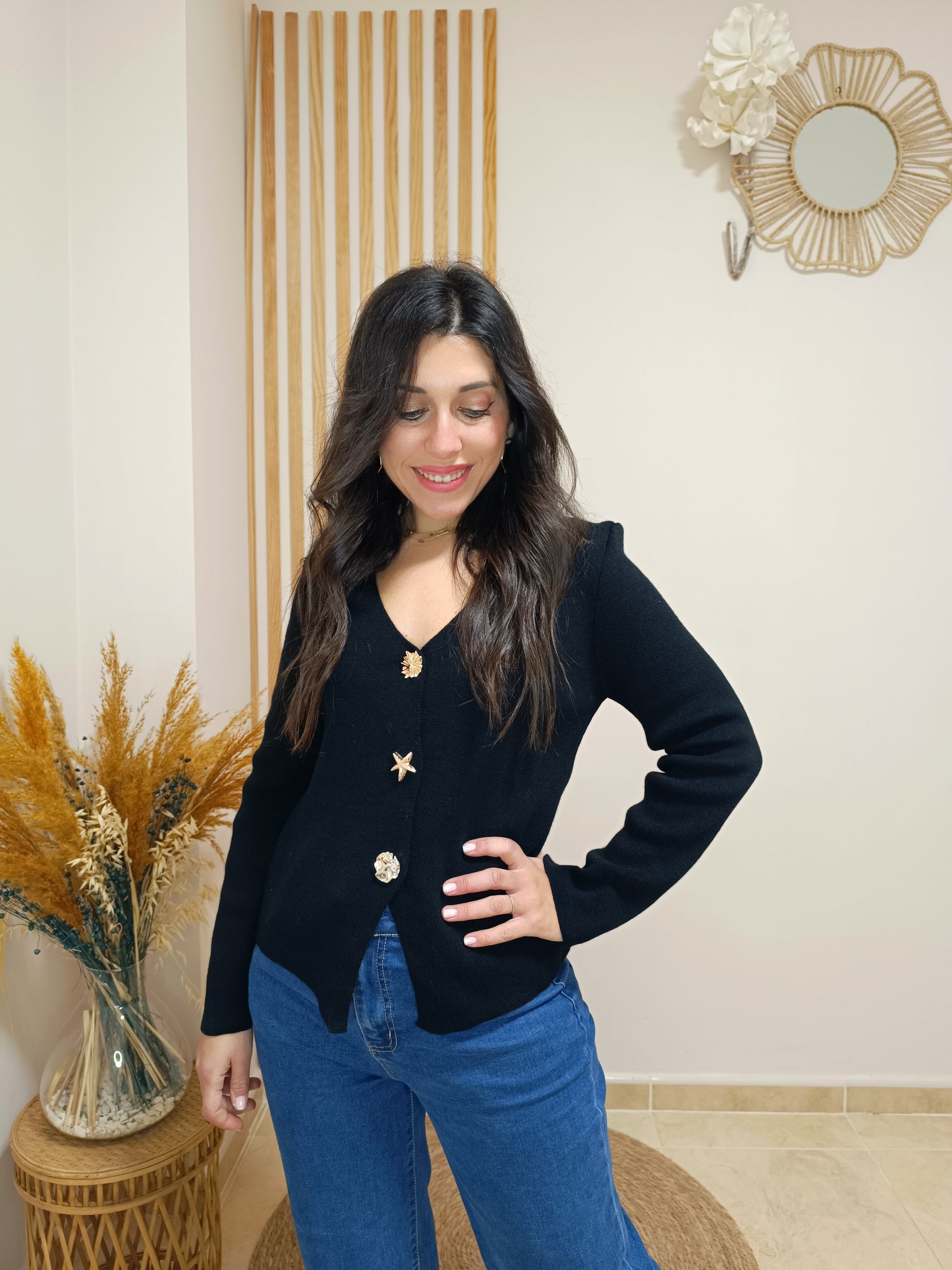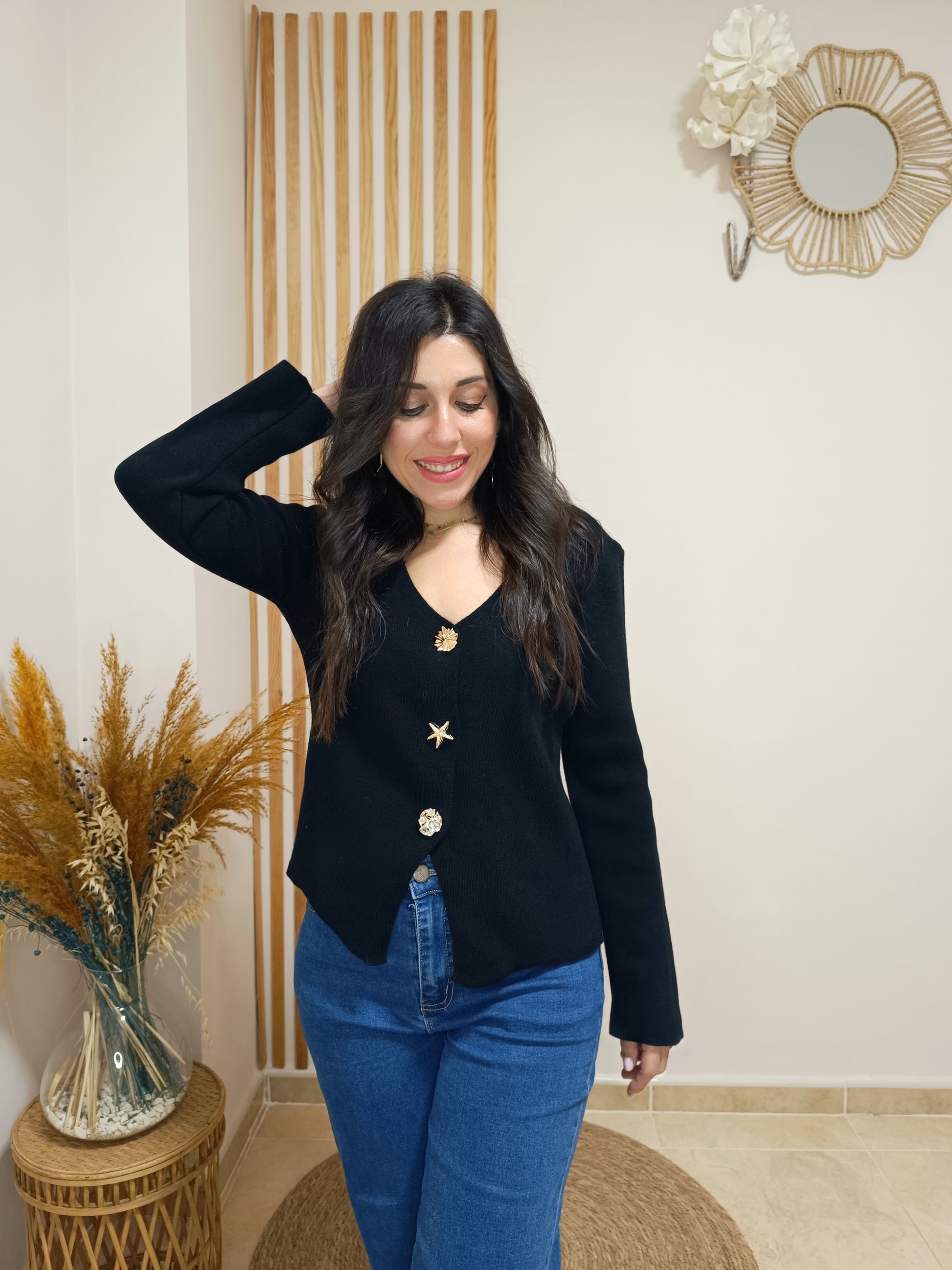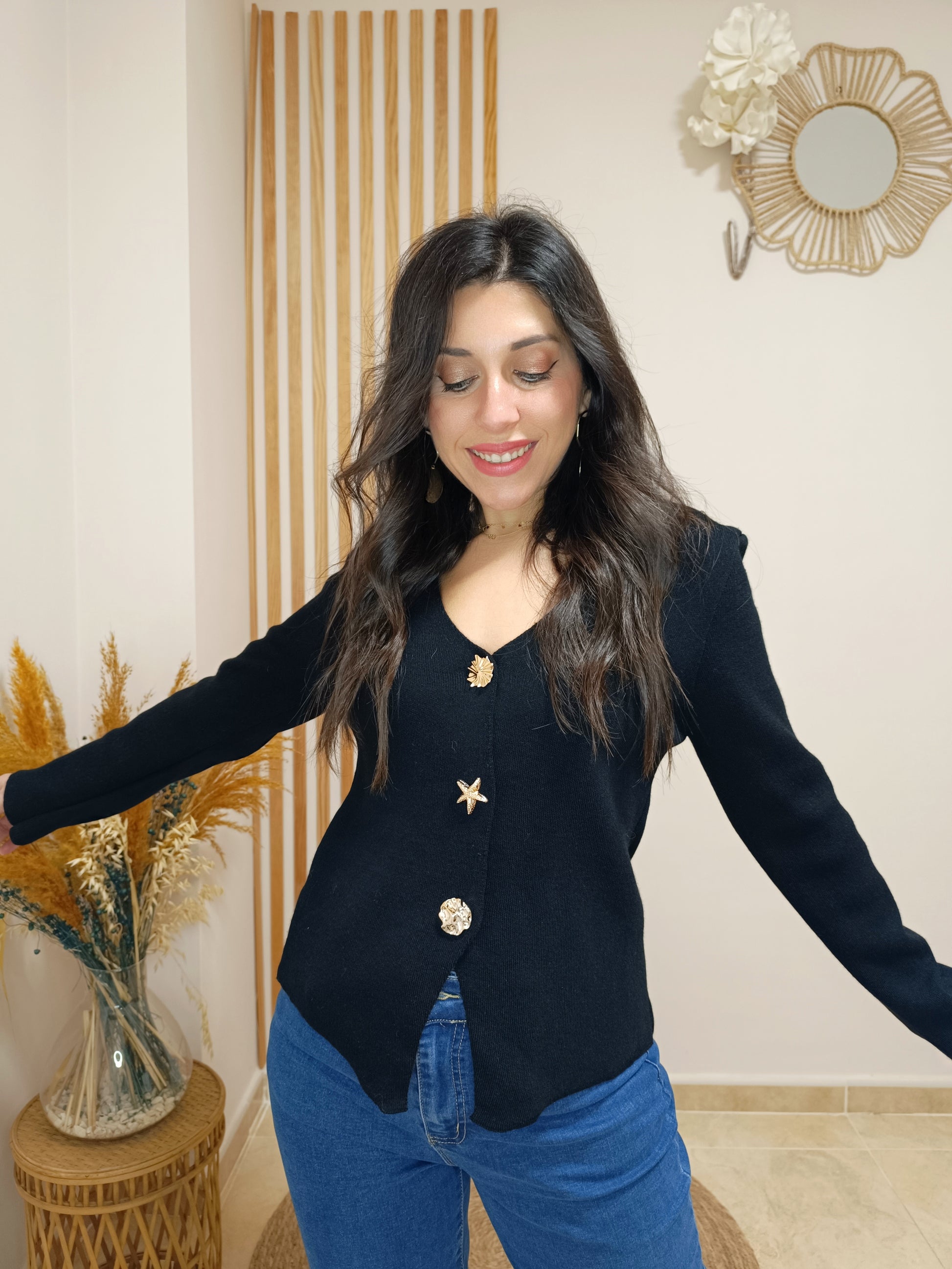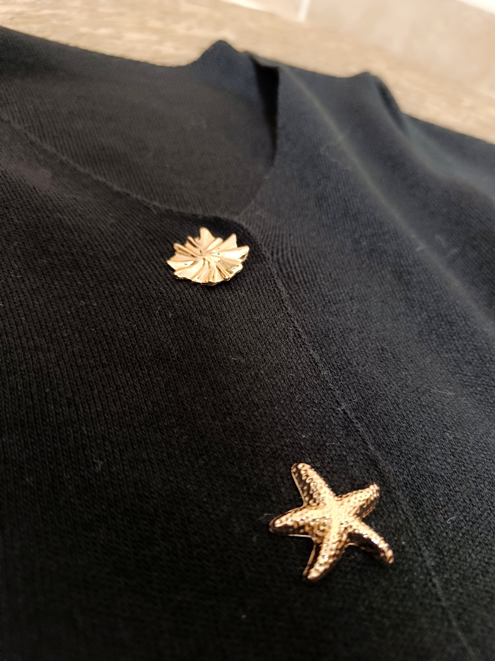 Nuestro top Ariel te encantará por sus originales maxibotones dorados con formas, uno de ellos simula una estrellita de mar de lo más ideal. ¿Lo mejor? Pues que podrás quitarlos y ponerlos sobre la prenda que quieras, ya que son broches con imperdible.