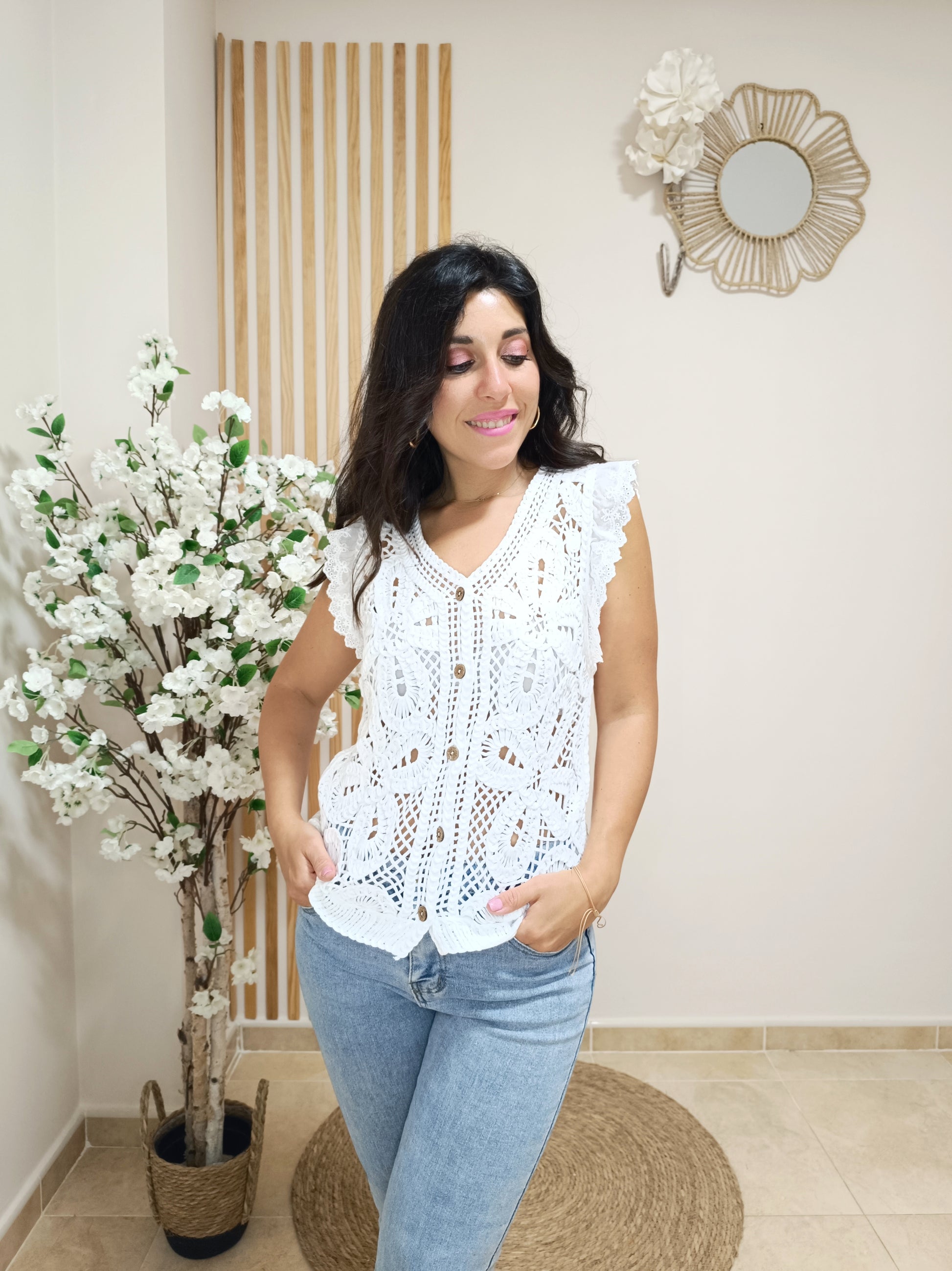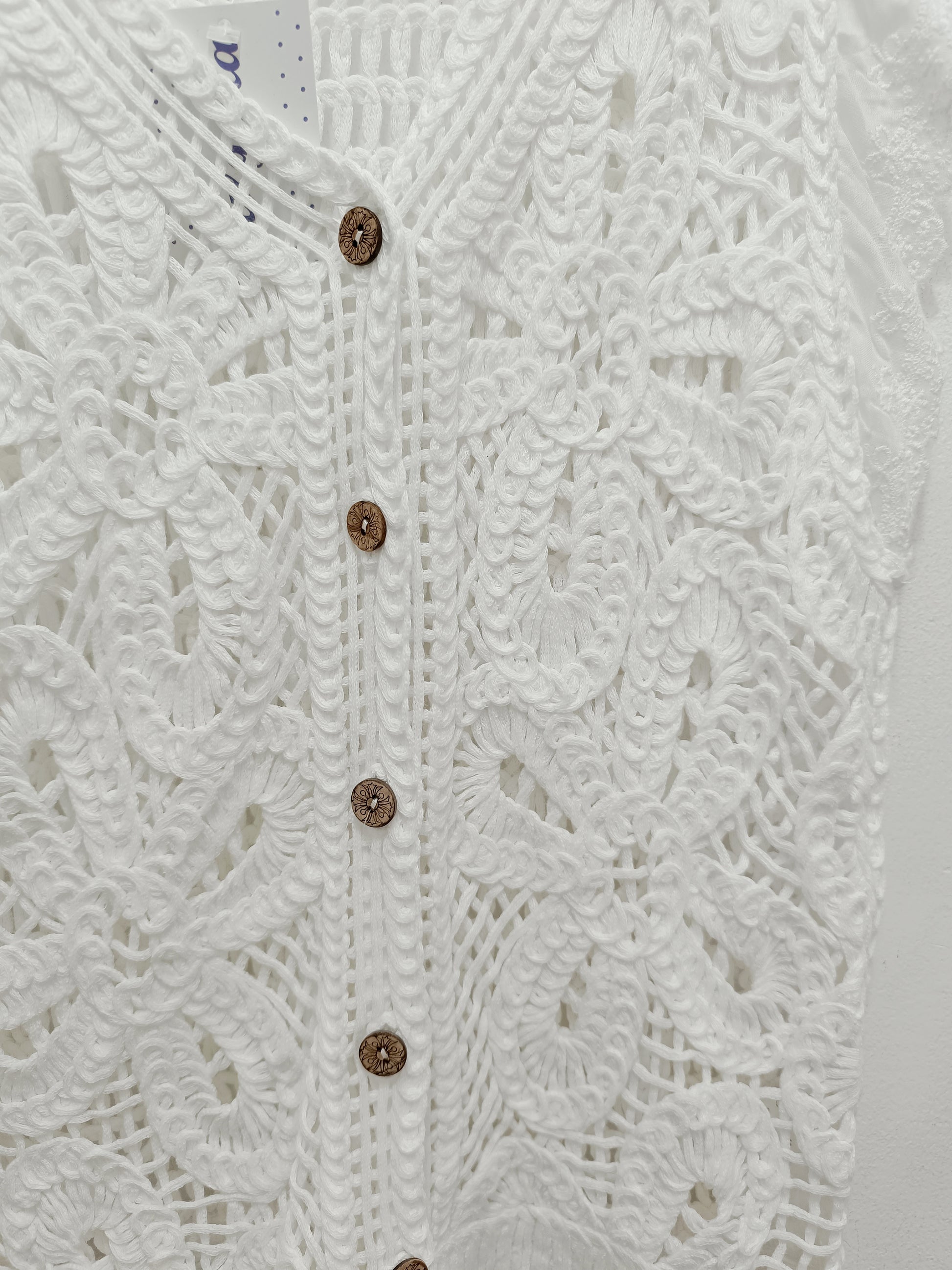 En 100% algodón, esta prenda tiene un calado con motivos florales y añade un toque dulce con un volante de puntilla en los hombros. Abotonado por la parte delantera, ya está en ti elegir llevarlo cerrado o abierto. Súper versátil y práctico para tu día a día, podrás combinarlo con vestidos, faldas largas o cualquier camiseta.