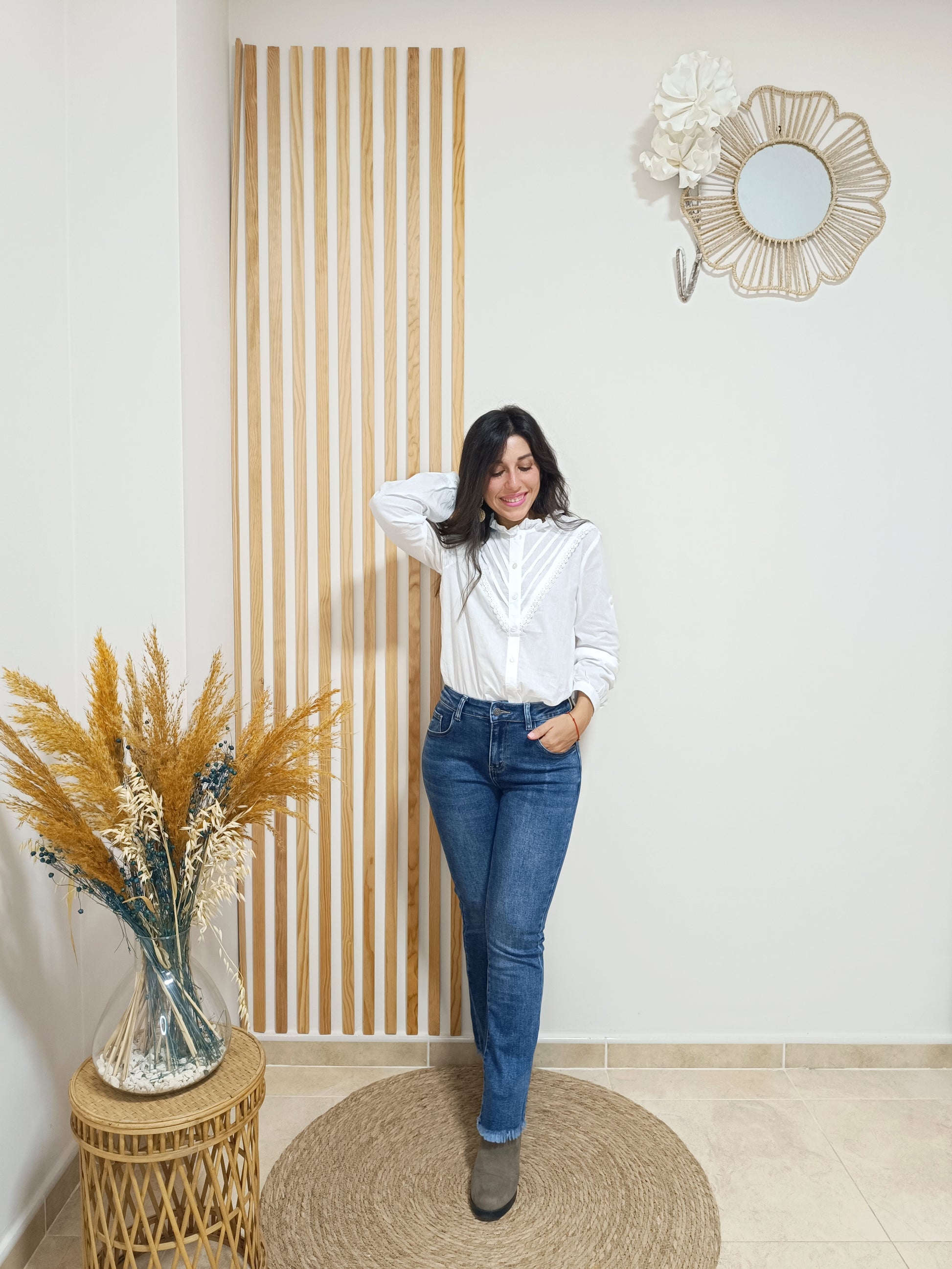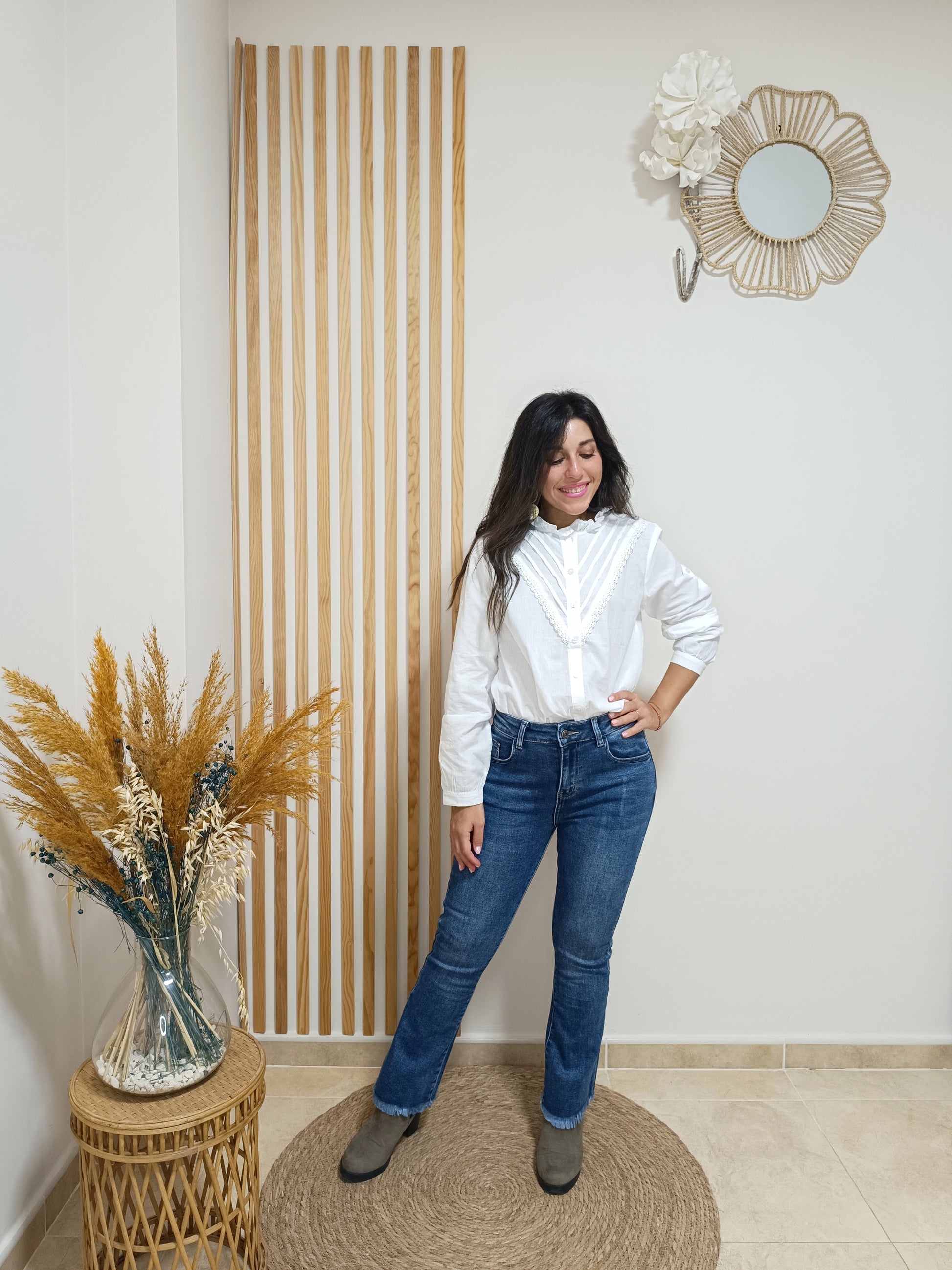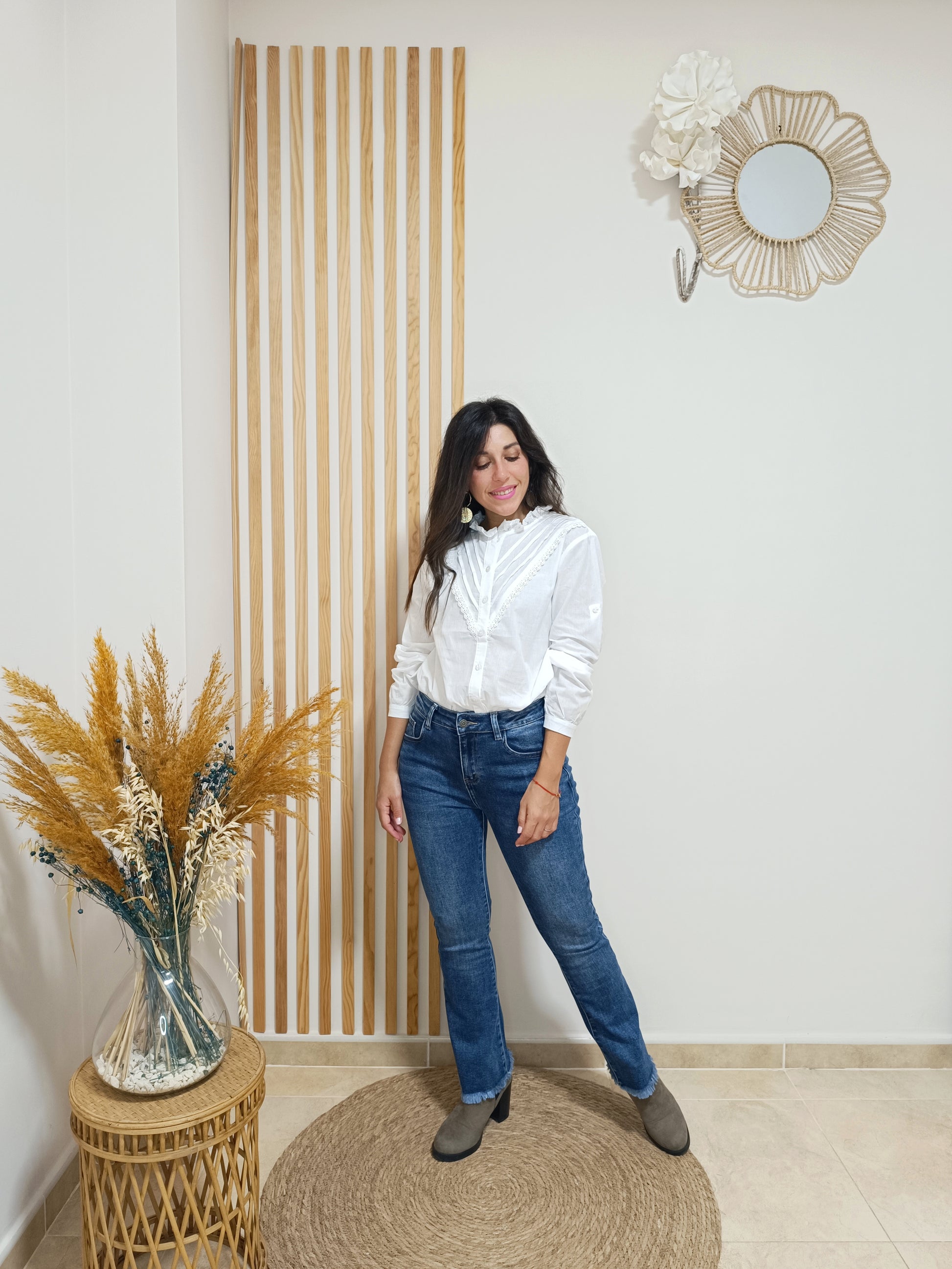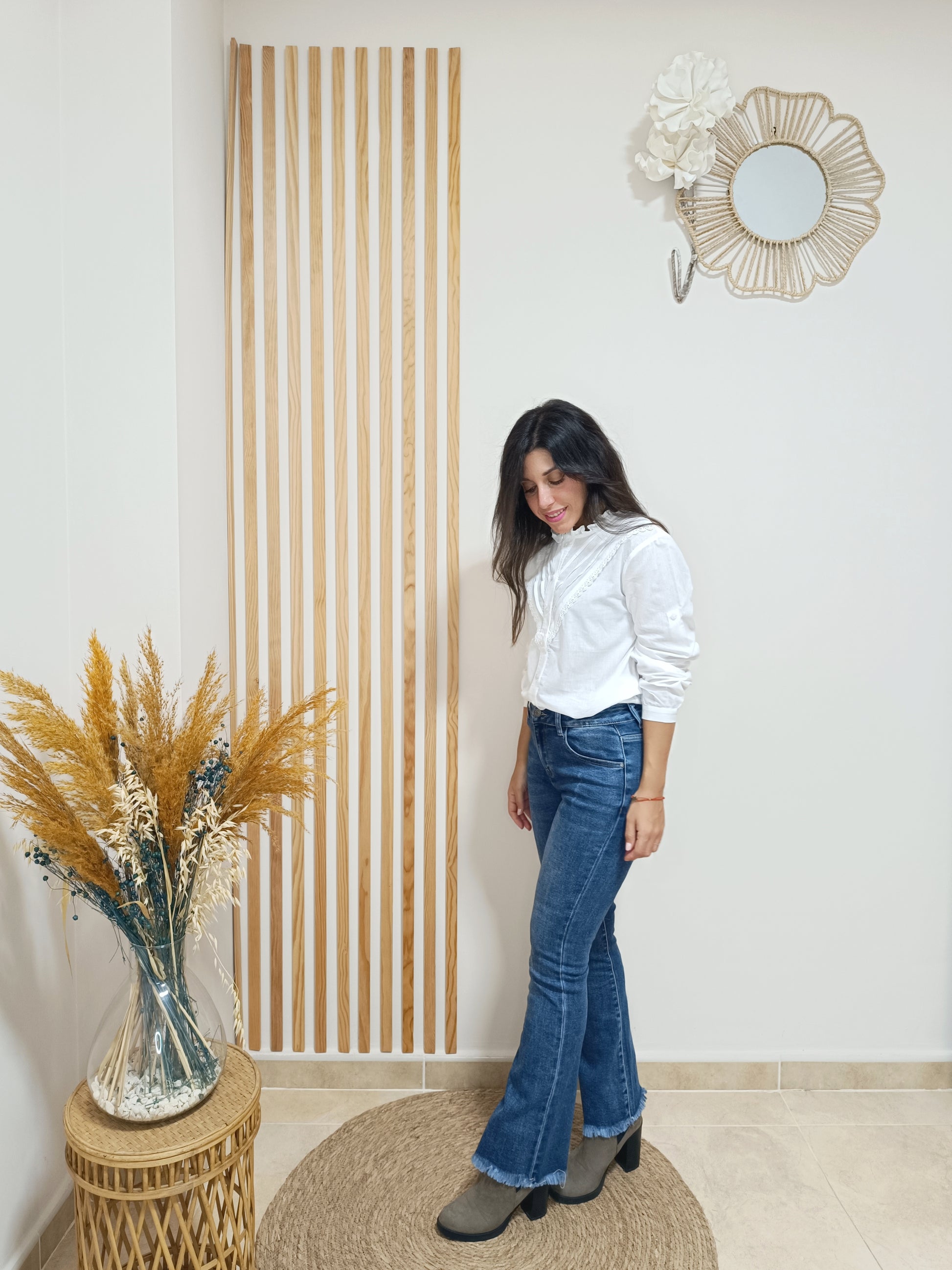 Es el largo de moda que marca tendencia esta temporada. La pata flared desflecada es la protagonista de nuestro vaquero Ginger. Con tiro alto, ajustado de pierna pero con un discreto corte acampanado a partir de debajo de la rodilla. Favorecedor a más no poder, este jean es perfecto para combinar con botas cowboy o botines de serraje.