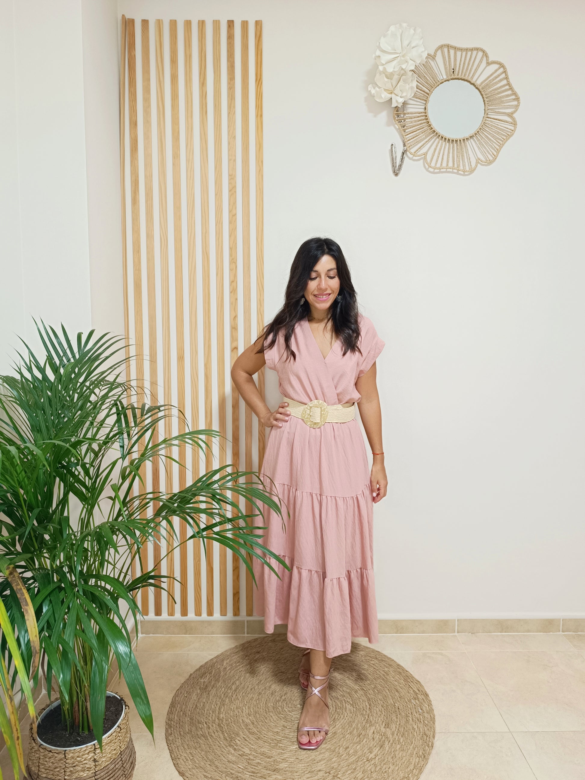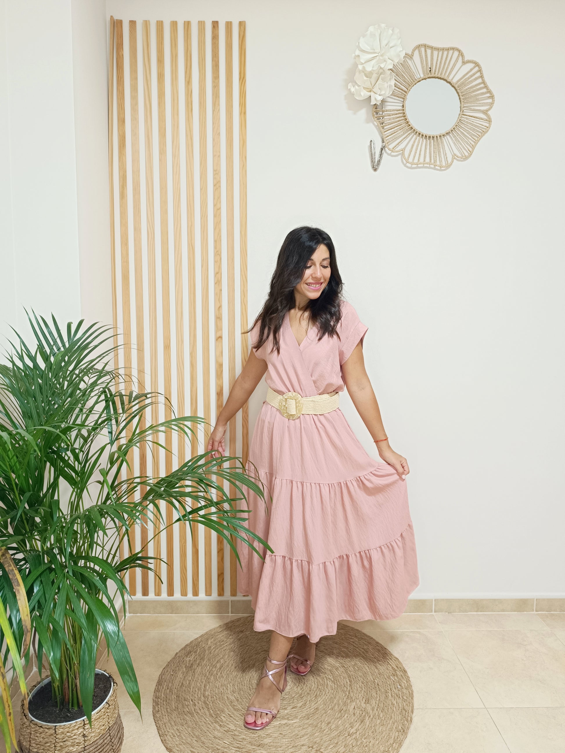Con escote en pico superpuesto, su cinturilla es totalmente elástica y va acompañado por una lazada de la misma tela que podrás utilizar a modo de cinturón. Su largo midi le aporta la versatilidad idónea para utilizarlo tanto de día como de noche. Su corte es ligeramente evasé, marcando los cortes de los volantes que añadirán movimiento a tus pasos.