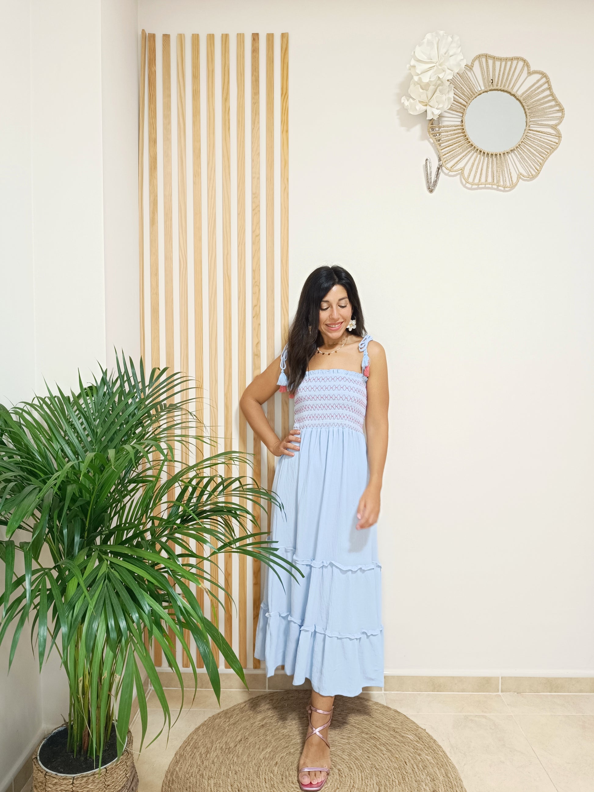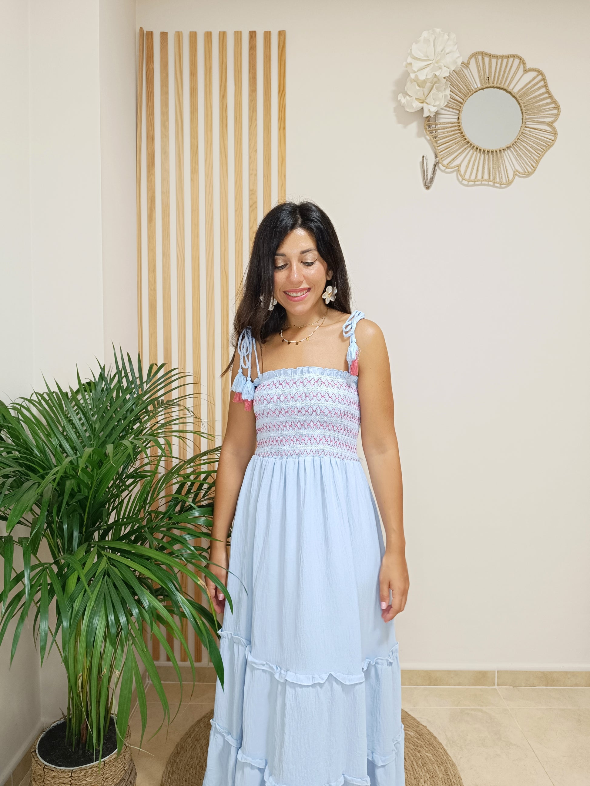 Estás avisada: este vestido va a convertirse en uno de tus preferidos este verano. Y, es que, nuestro vestido Bibiana lo tiene todo para ser esa prenda comodín que no pararás de ponerte en tus vacaciones. Con nido de abeja por toda la parte central del pecho y espalda, este corte engomado es súper cómodo y se adapta fácilmente a tu cuerpo, tengas más o menos pecho. Los tirantes a modo de cordones te permitirán anudarlo a la altura que desees, cruzarlos por la espalda... ¡Como más te guste!