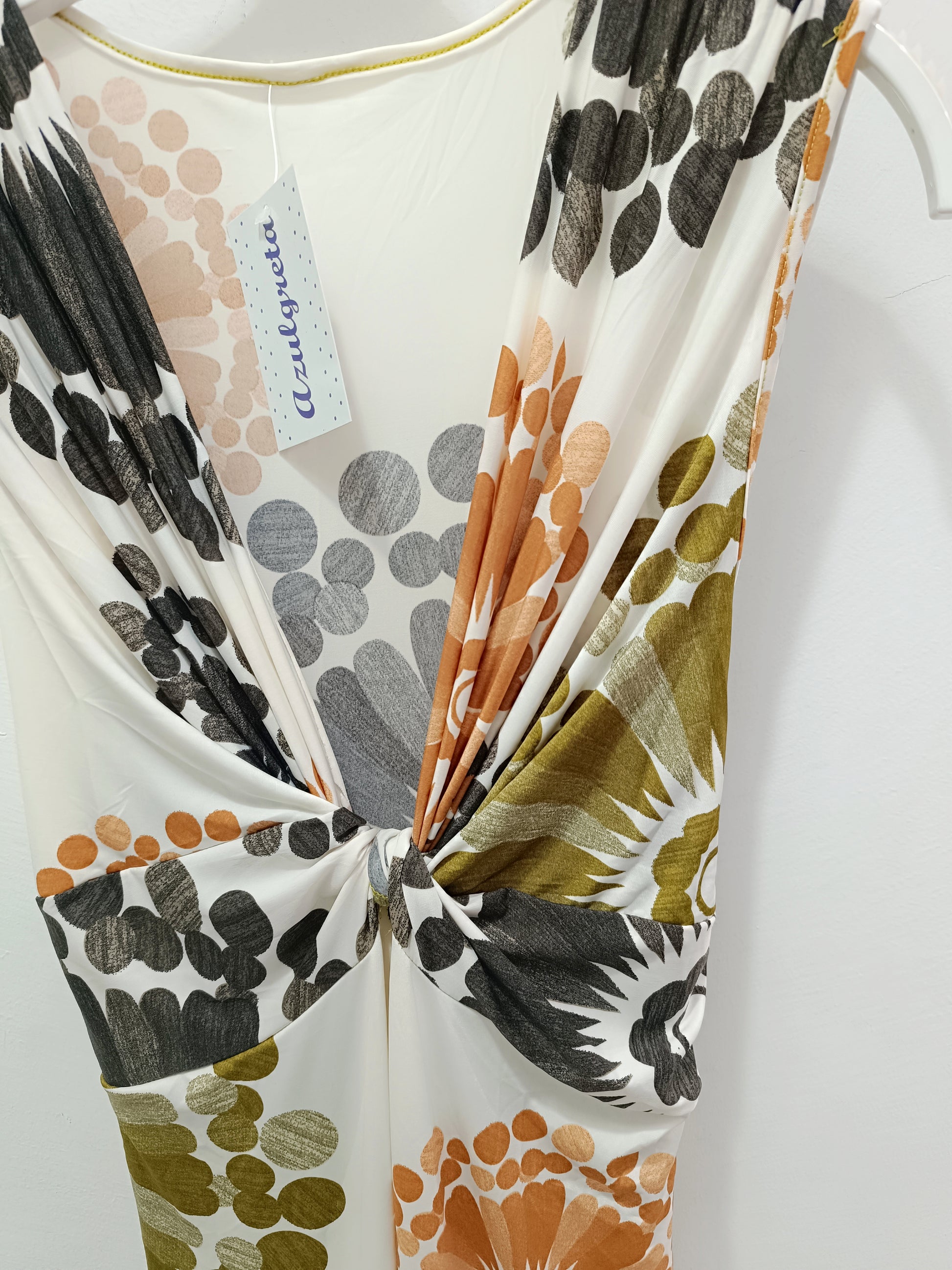 El vestido Idalia está confeccionado en licra fría y es el candidato perfecto para realzar tu silueta y marcar curvas. Con un favorecedor escote en pico con fruncido central, este vestido resalta tu cintura y te permite ajustarlo al gusto gracias a una lazada de la misma tela que asoma a ambos lados. Sobre un fondo en color hueso, el vestido Idalia es perfecto para el verano gracias a su estampado con grandes flores en tonos kakis y ocres.
