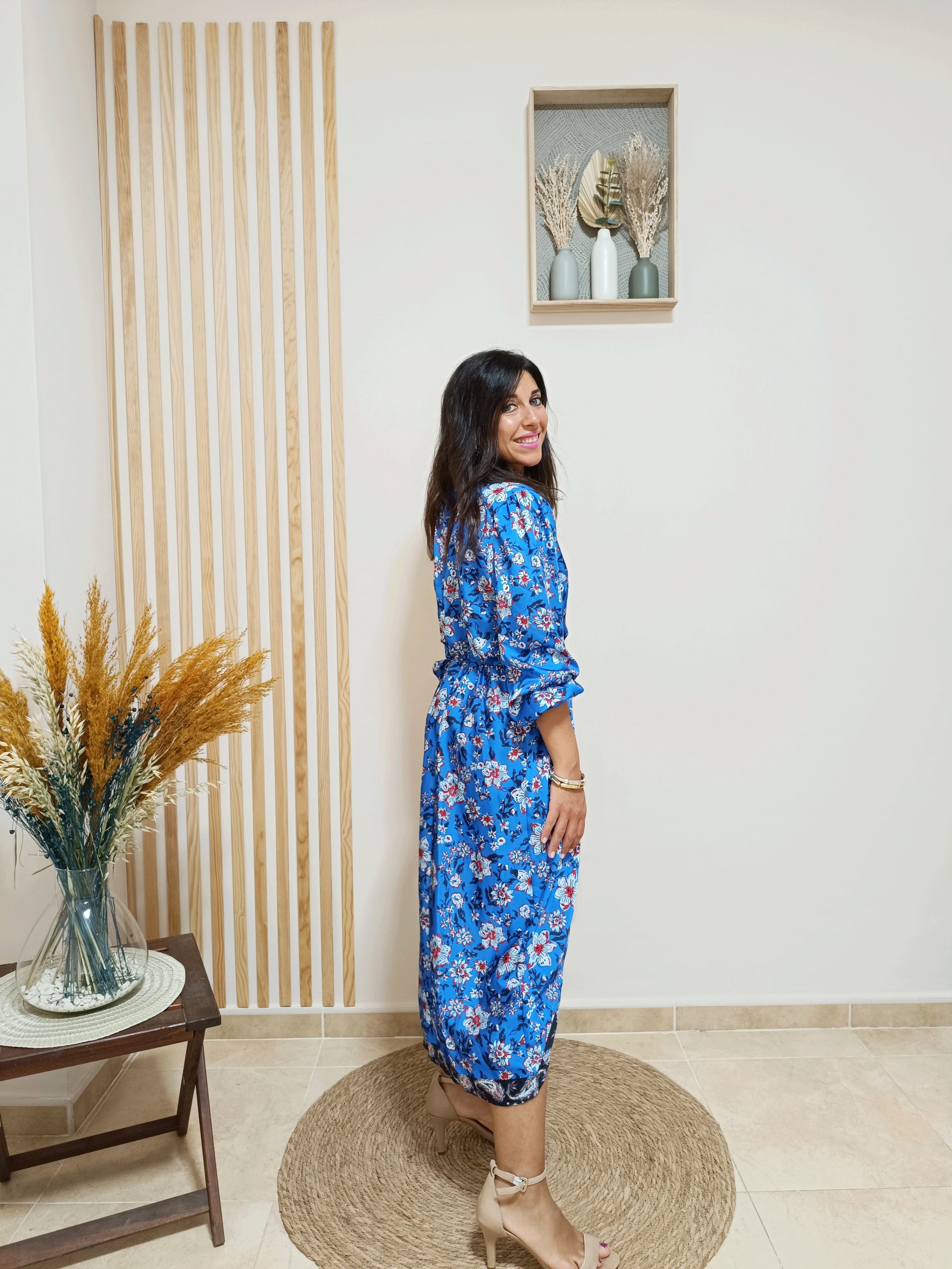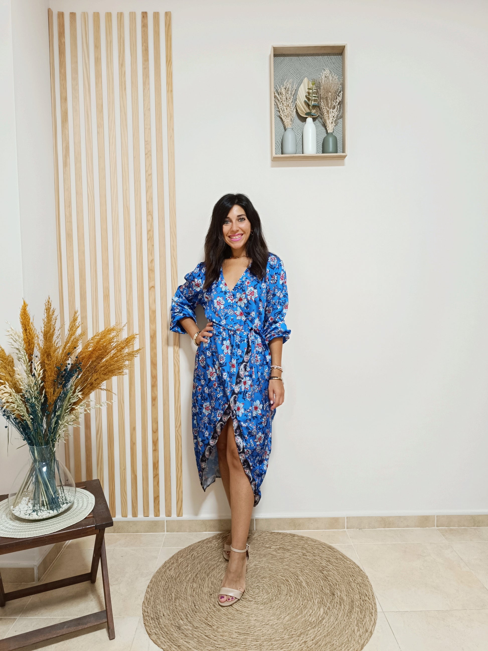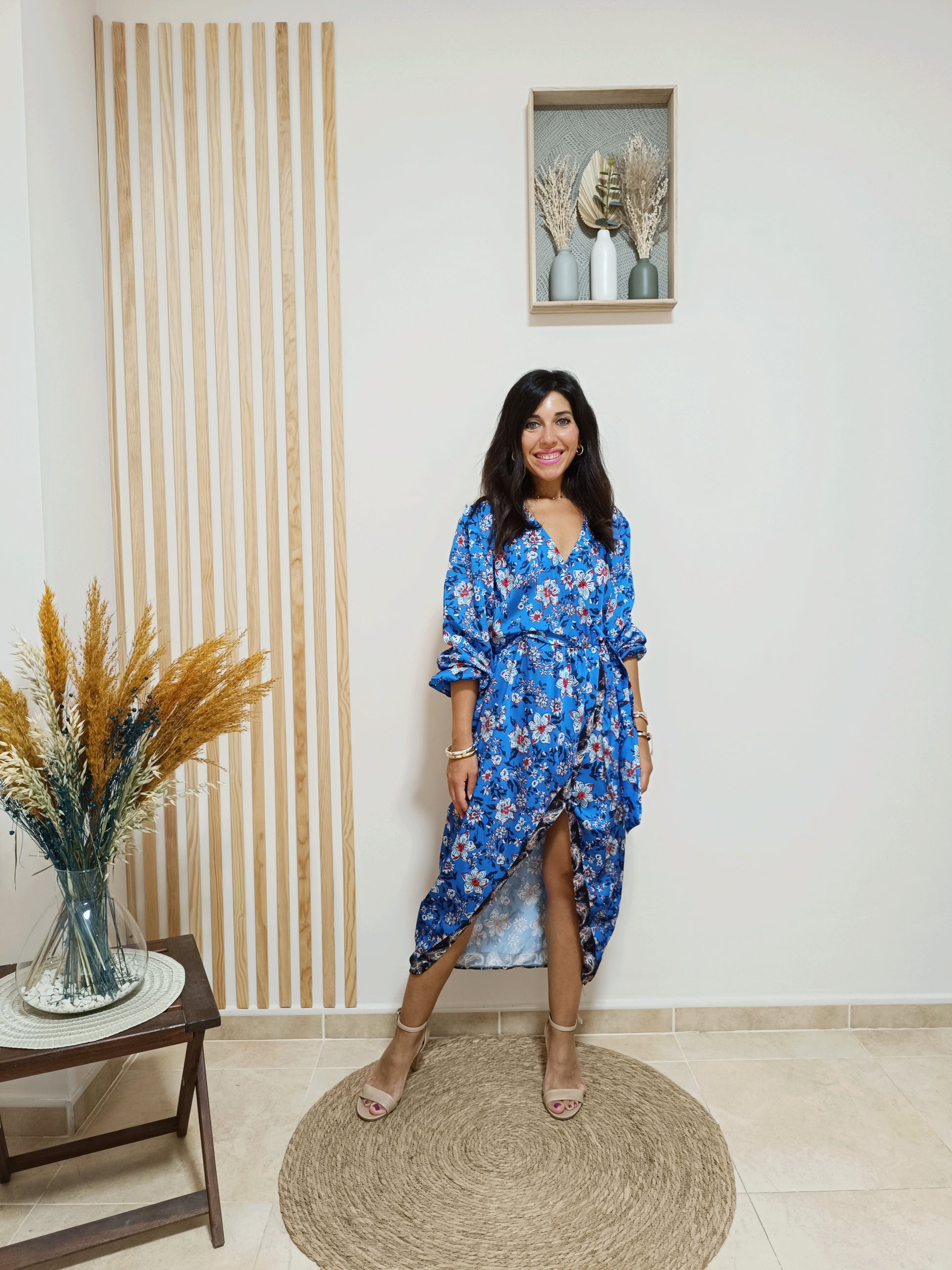 El vestido Melissa es una prenda cautivadora que destaca por su tela satinada y un estampado floral en tonos azul eléctrico, aportando un toque vibrante y sofisticado. Su escote de pico superpuesto añade feminidad, mientras que la cinturilla engomada ofrece comodidad y define la silueta.