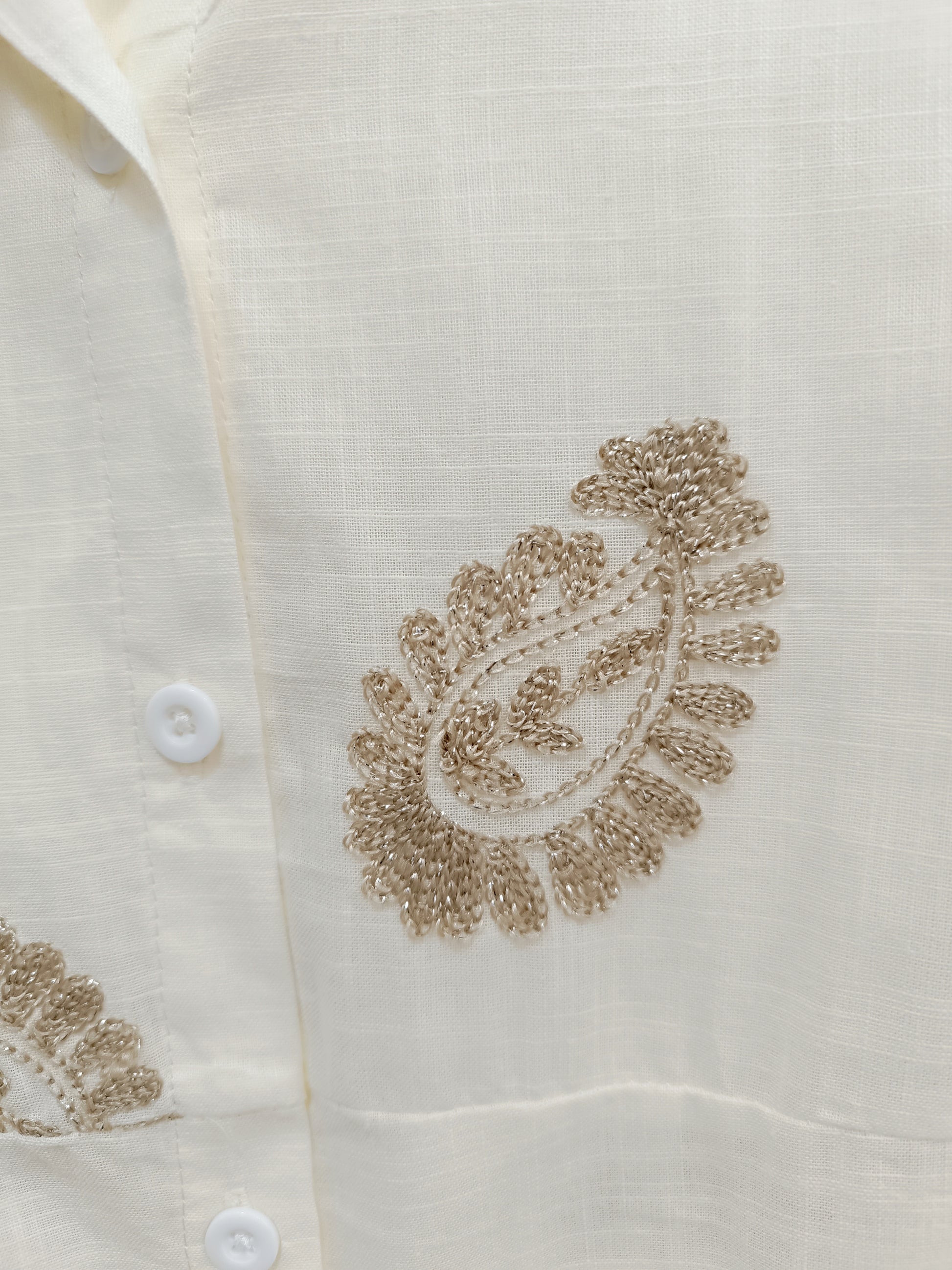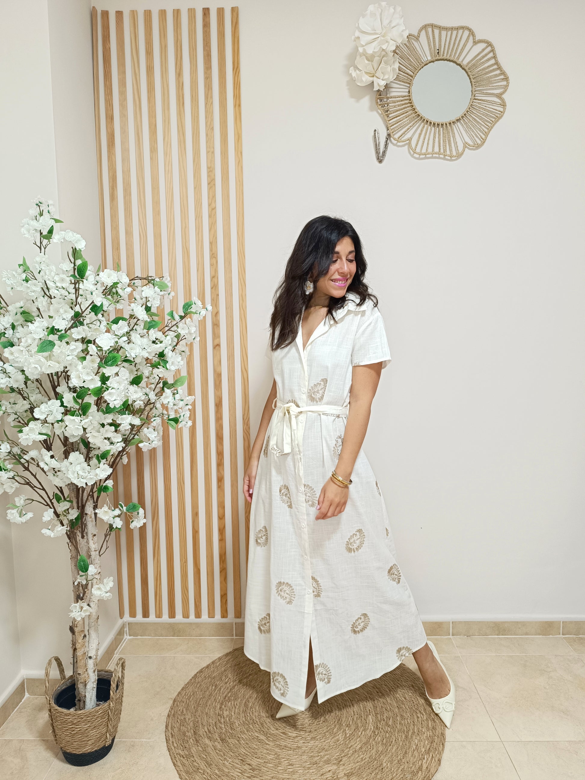 En un blanco impoluto o en un beige mantequilla, la delicadeza de estos dos colores consigue aún más resaltar los bordados en hilo dorado en forma del clásico paisley. Con corte camisero, el vestido Pandora va abotonado a lo largo de toda la parte central, con un delicado corte a la altura de la cintura y lazada de la misma tela para ajustar a modo de cinturón.