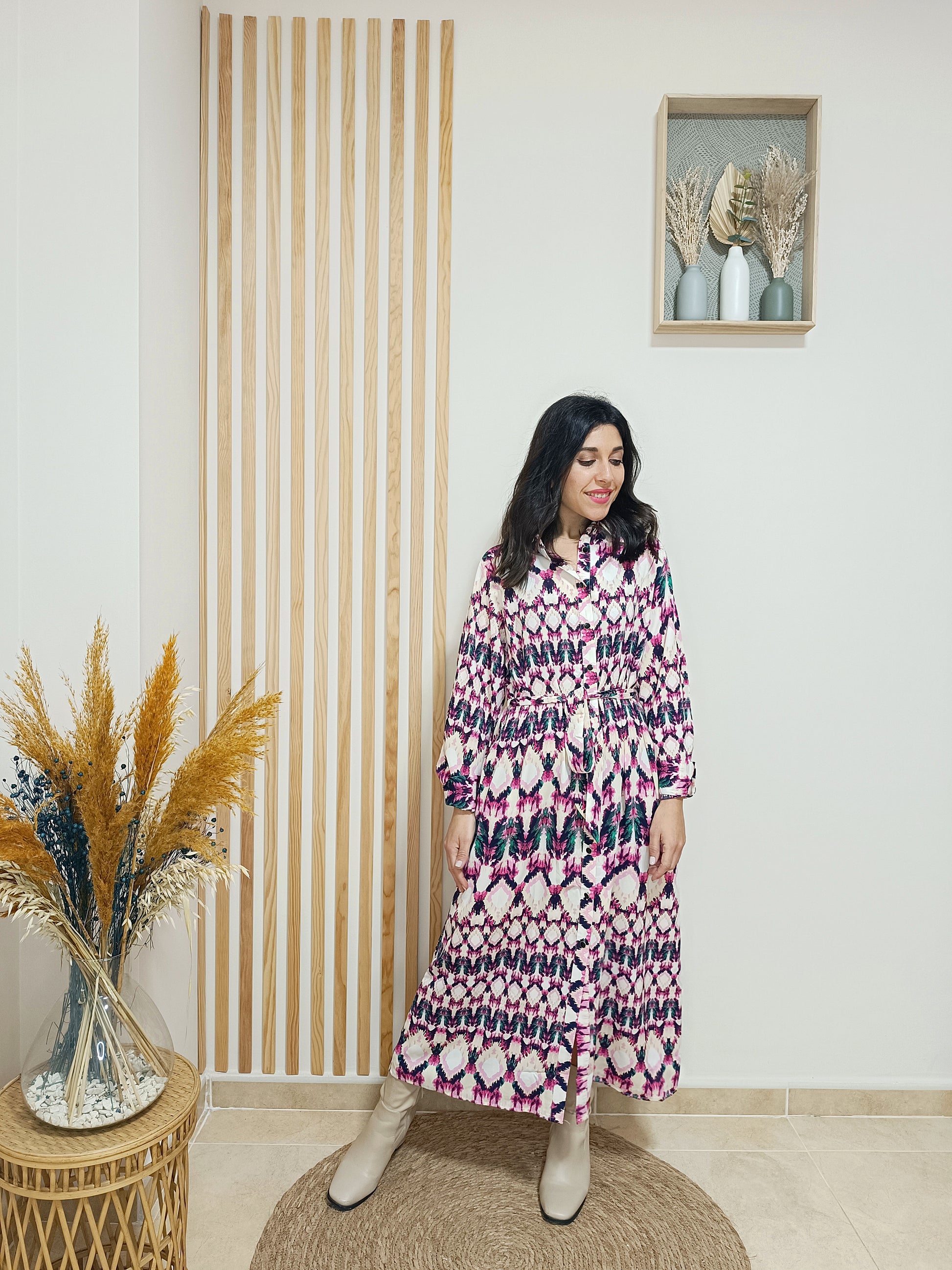 El vestido Veracruz es la combinación perfecta entre feminidad y estilo boho. Su diseño largo y camisero, con abotonado en la parte central, lo convierte en una prenda versátil y atemporal. Su estampado colorido con detalles tribales le aporta un aire primaveral y vibrante, ideal para looks llenos de personalidad.